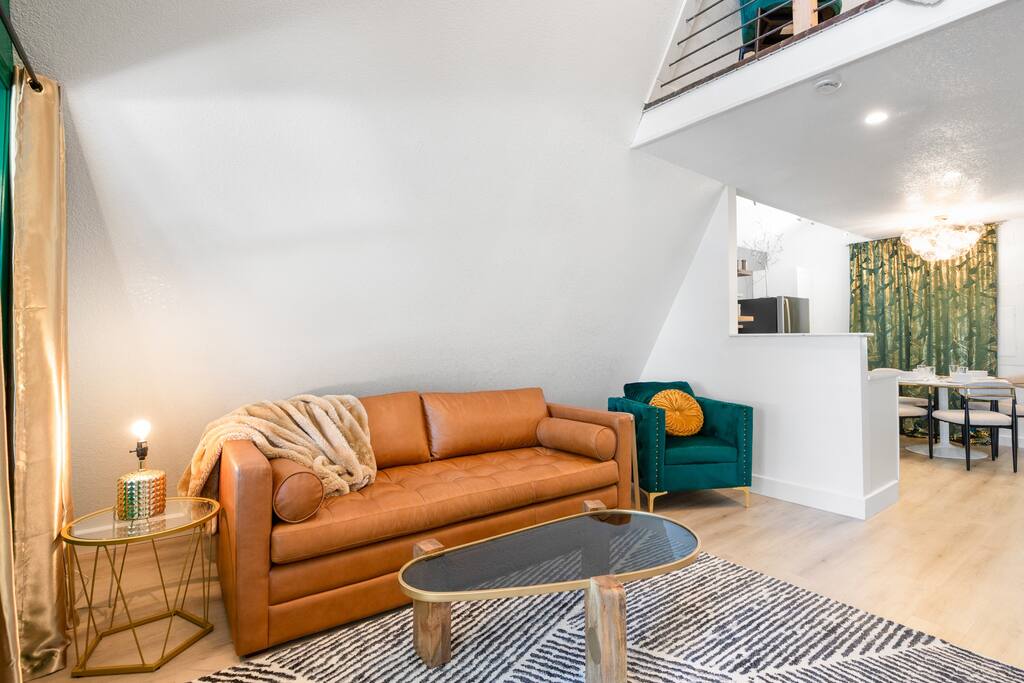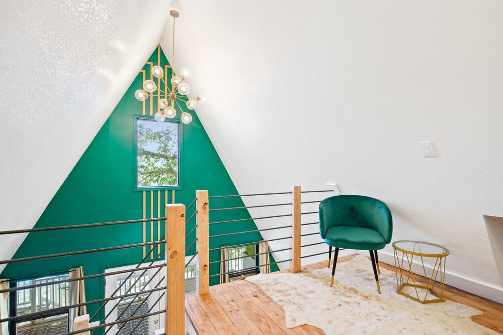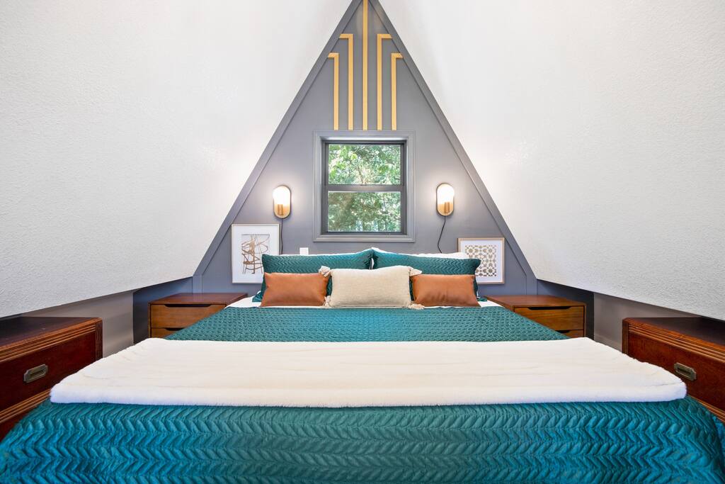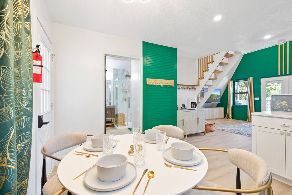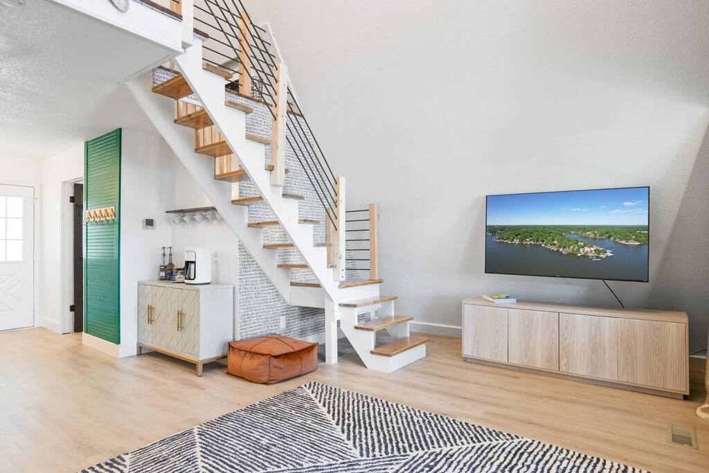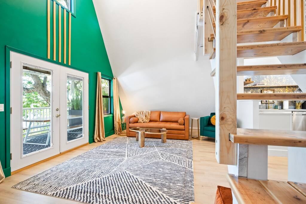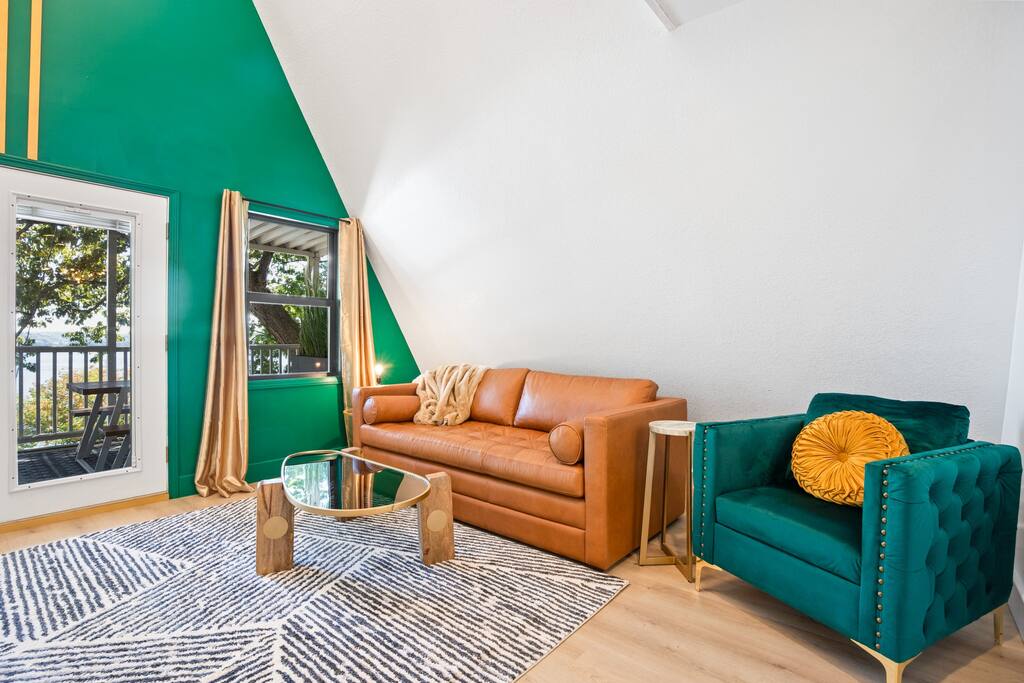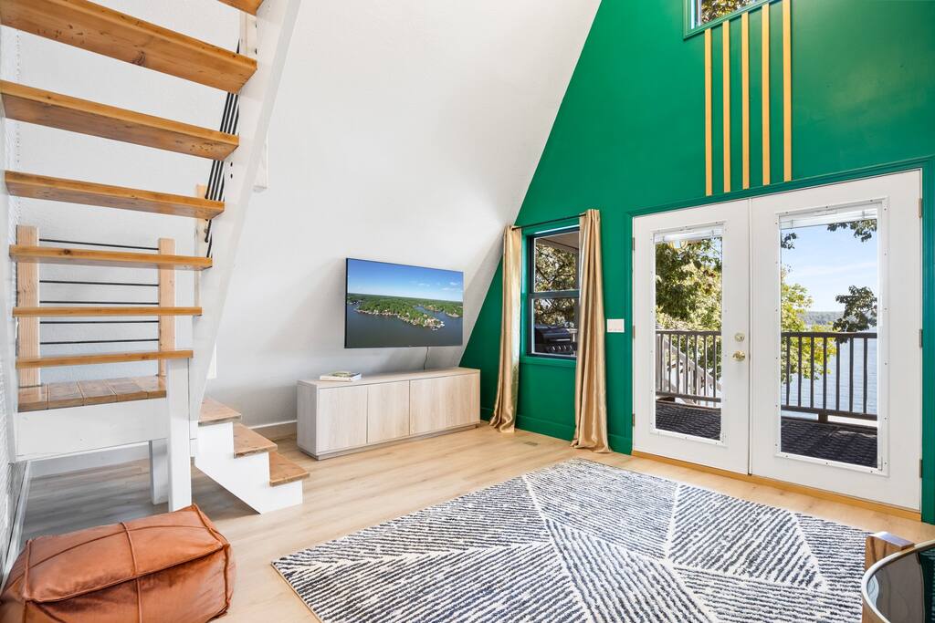 THE OUTDOOR -Porch Step onto the charming porch of our house, where the colorful door invites you in. Your perfect escape into nature begins here. -Private deck area Our charming house offers the perfect retreat for your getaway. You can relax in the hot tub, enjoy the BBQ grill with the stunning lake views. You will be surrounded by nature, making this the ideal spot to have some dinner in the outdoor deck. We count with 2 boat parking spaces. Measurements are 12x34 and 12x36! LIVING ROOM Adorned with chic decor and with natural light. This space offers stunning lake views that will leave you breathless. Relax on the comfortable sofa while looking through the windows. DINNING AREA Enchanting area with seating for 4. KITCHEN You can't leave Emerald A without enjoying the fully equipped kitchen to prepare amazing dishes. BATHROOM Featuring a double shower and gold details, this space offers a spa-like experience. PRIMARY BEDROOM - Loft This cozy retreat has a king bed, adorned with lovely colors. To add a touch of warmth and ambiance, an electric fireplace casts a soothing glow. Additional Sleeping Area Sofa bed in the living room.