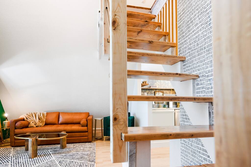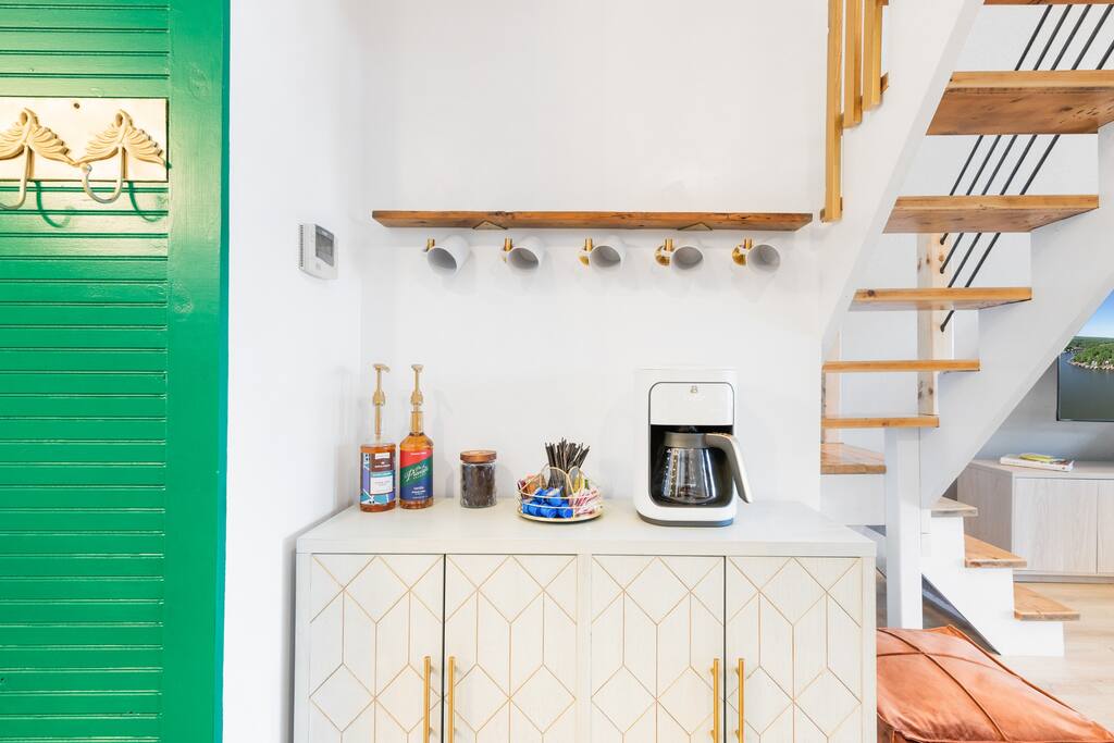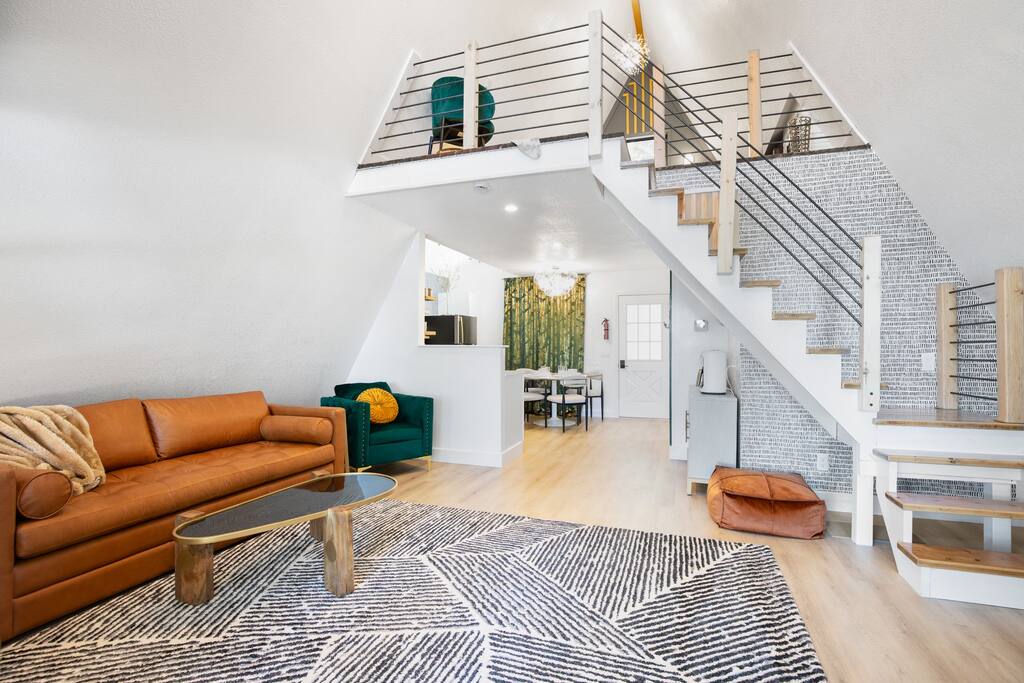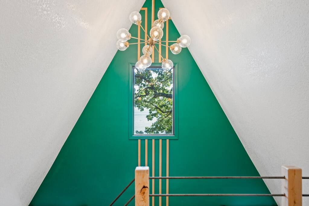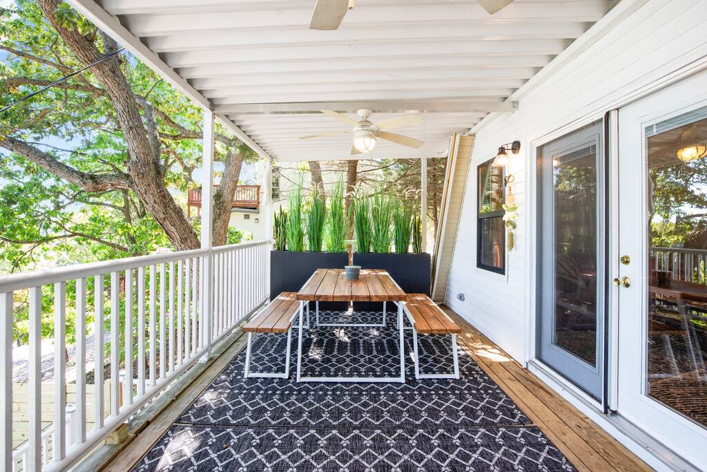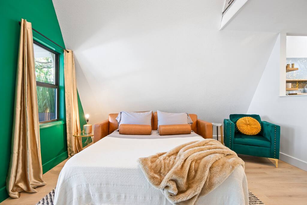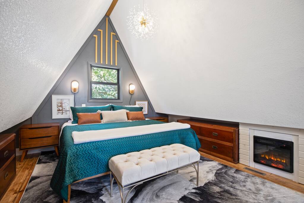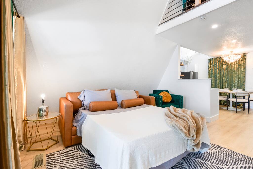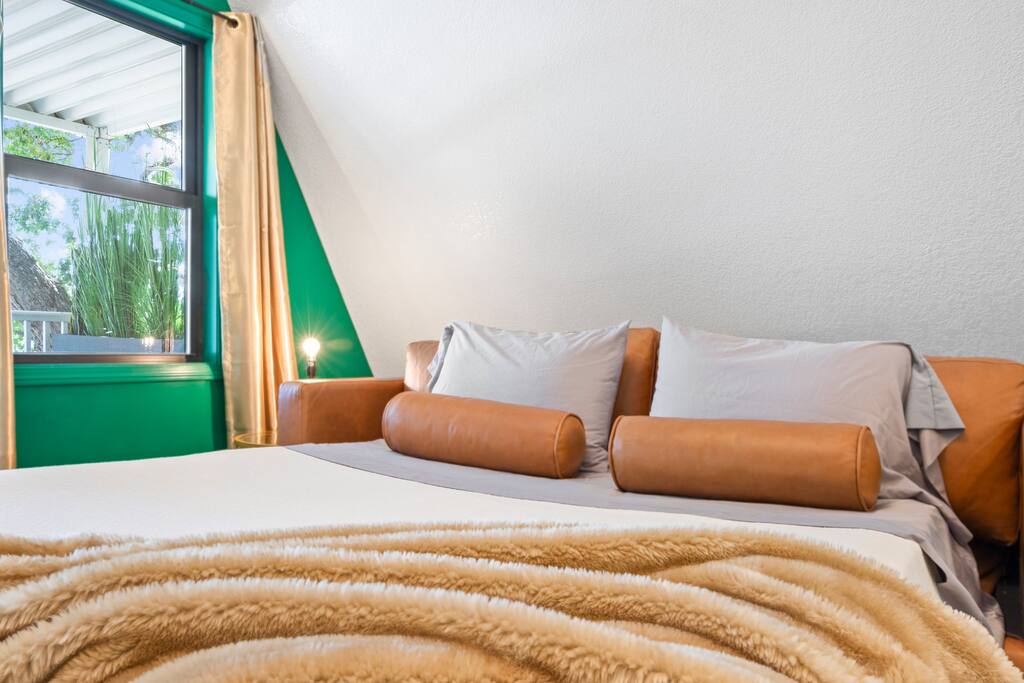 THE OUTDOOR -Porch Step onto the charming porch of our house, where the colorful door invites you in. Your perfect escape into nature begins here. -Private deck area Our charming house offers the perfect retreat for your getaway. You can relax in the hot tub, enjoy the BBQ grill with the stunning lake views. You will be surrounded by nature, making this the ideal spot to have some dinner in the outdoor deck. We count with 2 boat parking spaces. Measurements are 12x34 and 12x36! LIVING ROOM Adorned with chic decor and with natural light. This space offers stunning lake views that will leave you breathless. Relax on the comfortable sofa while looking through the windows. DINNING AREA Enchanting area with seating for 4. KITCHEN You can't leave Emerald A without enjoying the fully equipped kitchen to prepare amazing dishes. BATHROOM Featuring a double shower and gold details, this space offers a spa-like experience. PRIMARY BEDROOM - Loft This cozy retreat has a king bed, adorned with lovely colors. To add a touch of warmth and ambiance, an electric fireplace casts a soothing glow. Additional Sleeping Area Sofa bed in the living room.