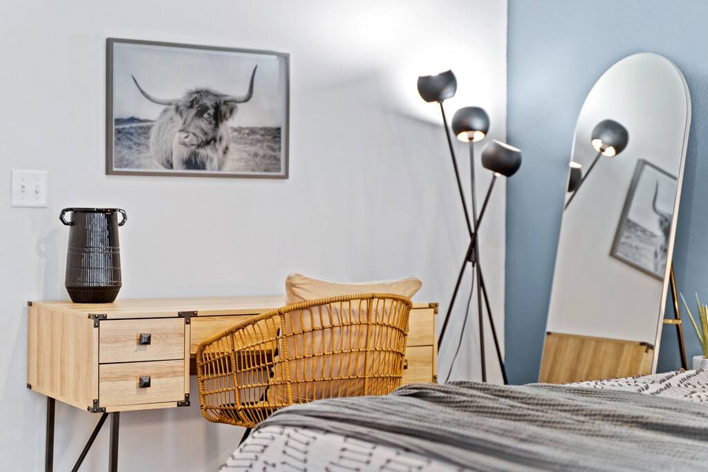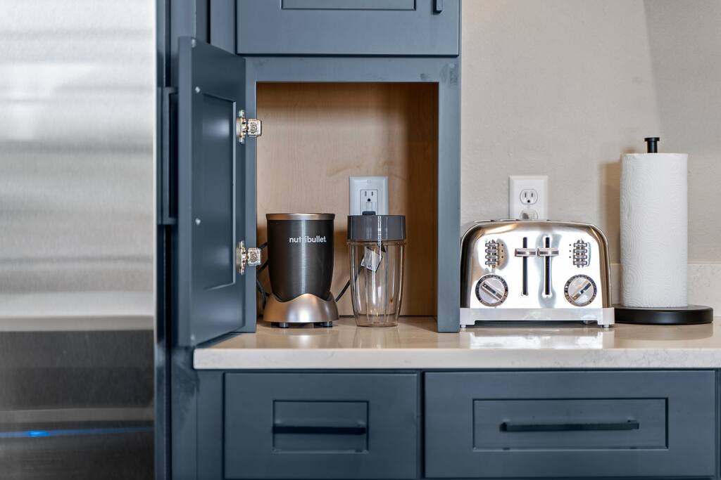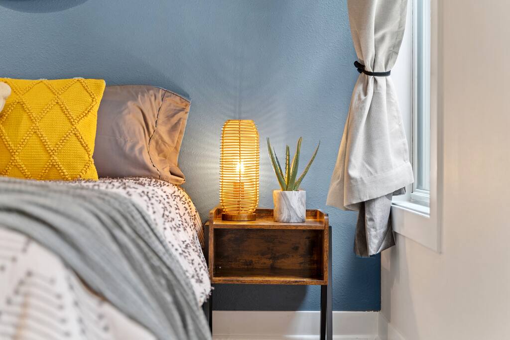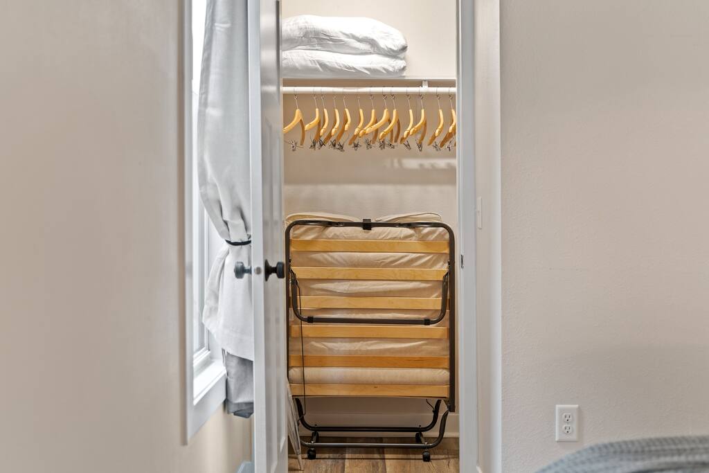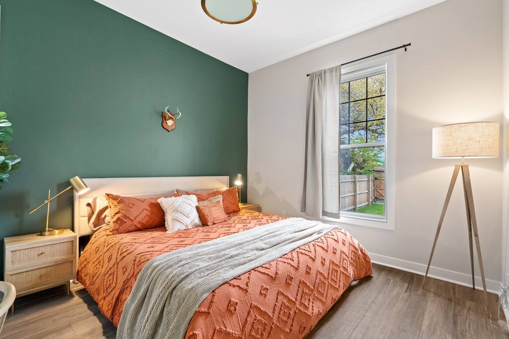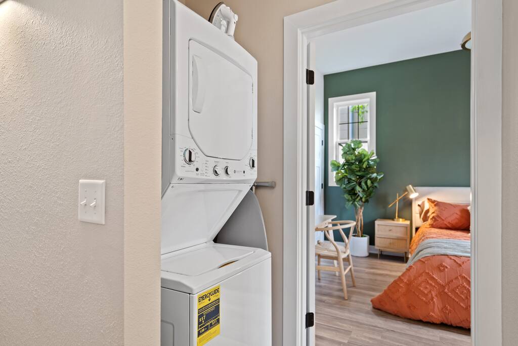 2 Bedrooms: This townhome can comfortably sleep up to 6 guests. - First Bedroom: King Bed and Twin Sized rollaway stored in the closet with fresh linens, pillows and blankets. - Second Bedroom: King Bed and Twin Sized rollaway stored in the closet with fresh linens, pillows and blankets. Kitchen/Living Room: • Open concept kitchen/living room provides ample space to hangout with friends and family, play board games, watch the 60” Smart TV, or cook meals in the full kitchen with stainless steel appliances and non-stick pans. Enjoy complimentary coffee/tea and fast Wi-Fi. Bathroom: • Full bathroom with fresh towels, hair dryer, toilet paper and complimentary body lotion/shampoo/conditioner/body wash. Washer/Dryer • There is a stacked washer/dryer with complimentary detergent. Private Backyard with Garage • Fenced-in backyard (shared) with private garage accessed via the back alley.