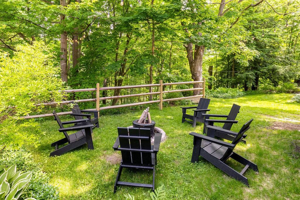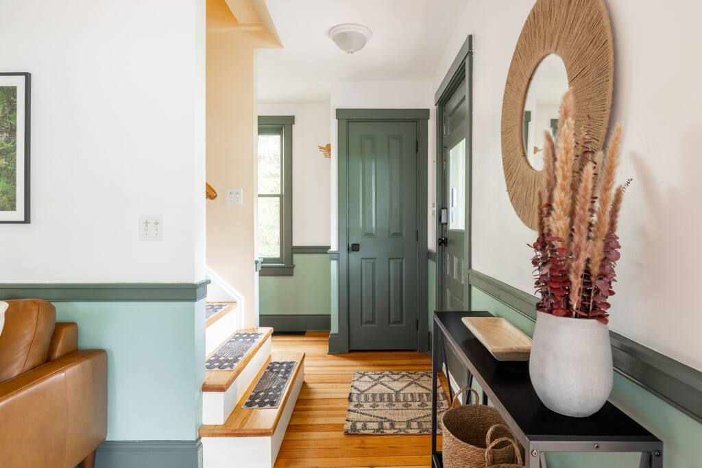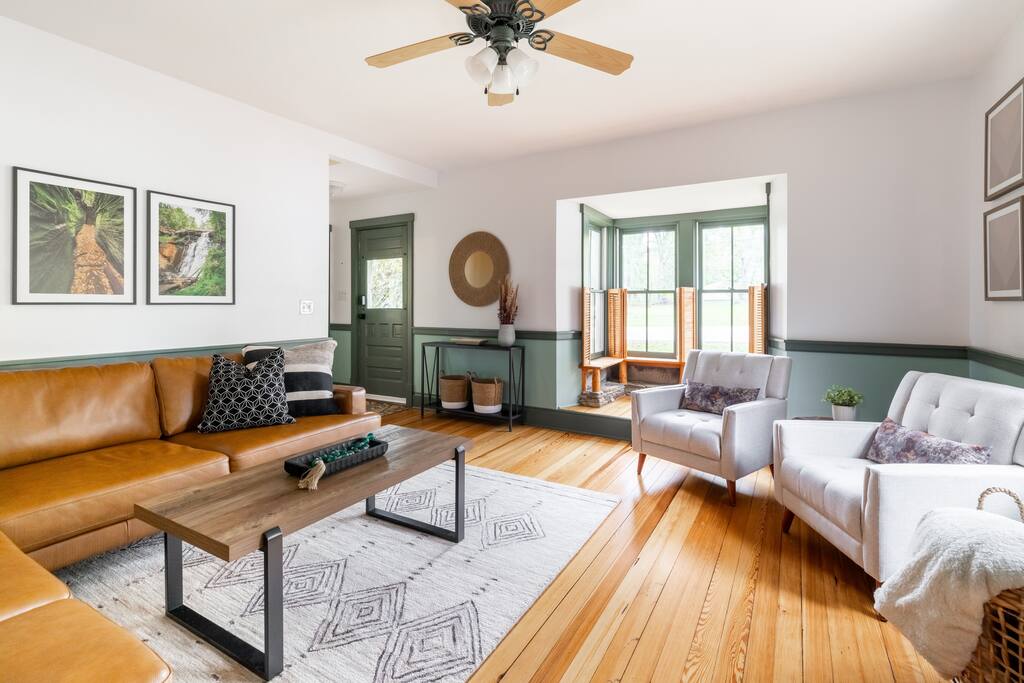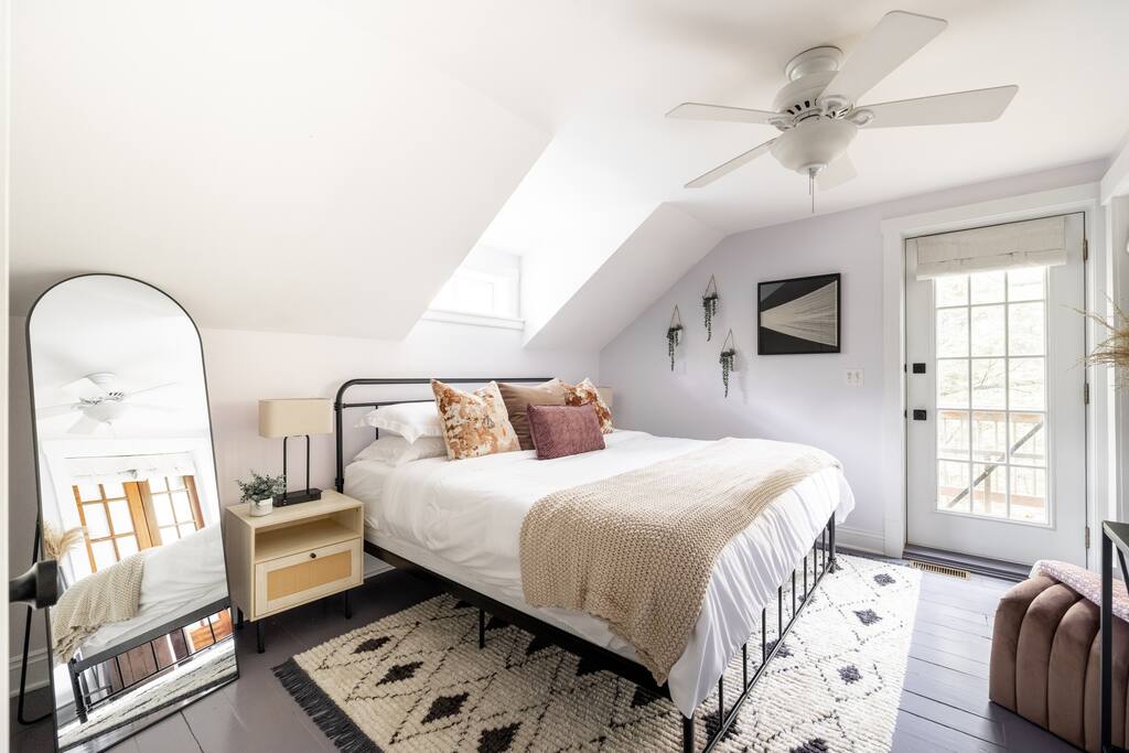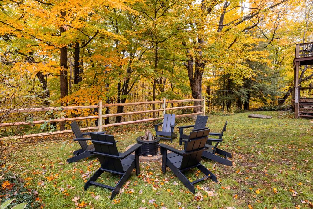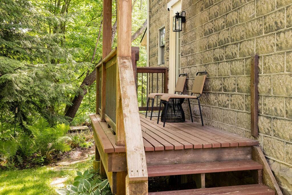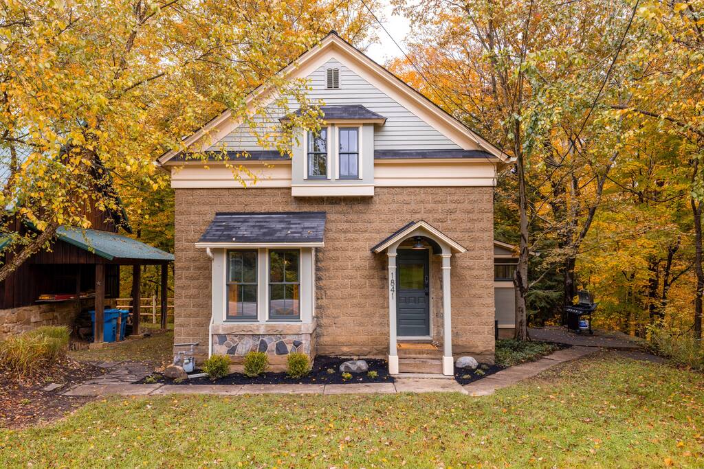 Enjoy the balance of nature and convenience in our home that will comfortably accommodate up to 6 guests. With serene wooded views from the hot tub and an on-property trail that leads to a waterfall view, our home is perfect for nature lovers or those looking for a relaxing escape. This home features three cozy bedrooms and one and a half bathrooms. The primary bedroom is complete with a plush king-size bed and a private balcony for morning coffee while the other two bedrooms are furnished with queen-sized beds. All bedrooms have blackout blinds, extra pillows and blankets, Roku TVs, and USB ports for your device charging. The fully stocked kitchen, including spices and cooking oil, is perfect for making home-cooked meals while the dining room has ample space to fit everyone. You’ll love lounging in the aesthetically designed living room playing games or watching Roku TV with your group. Finally, the three seasons room offers a beautiful spot for morning yoga, enjoying a nature view, or curling up with a book. Step outside and discover your private oasis. The hot tub and fire pit, overlooking a wooded area, set the scene for cozy evenings under the stars with six adirondack chairs. Roast marshmallows, share stories, and create lasting memories with loved ones. The outdoor gas grill is perfect for barbecue nights, and the spacious front yard provides ample room for yard games and outdoor activities. Please note that this is a historic home and there are some slanted ceilings on the second floor. It’s also located on a main road through the village. Short Term Rental Operator License: 2026-06
