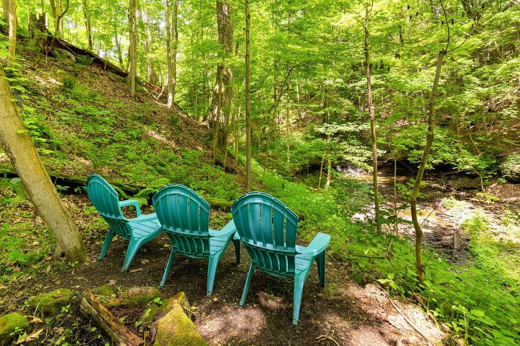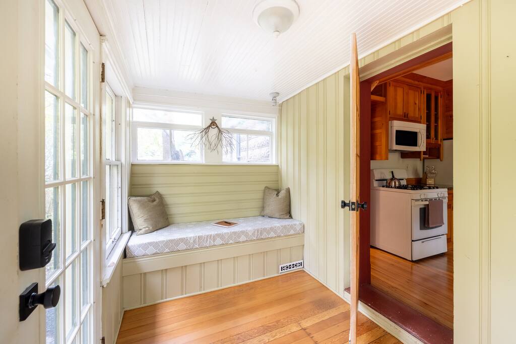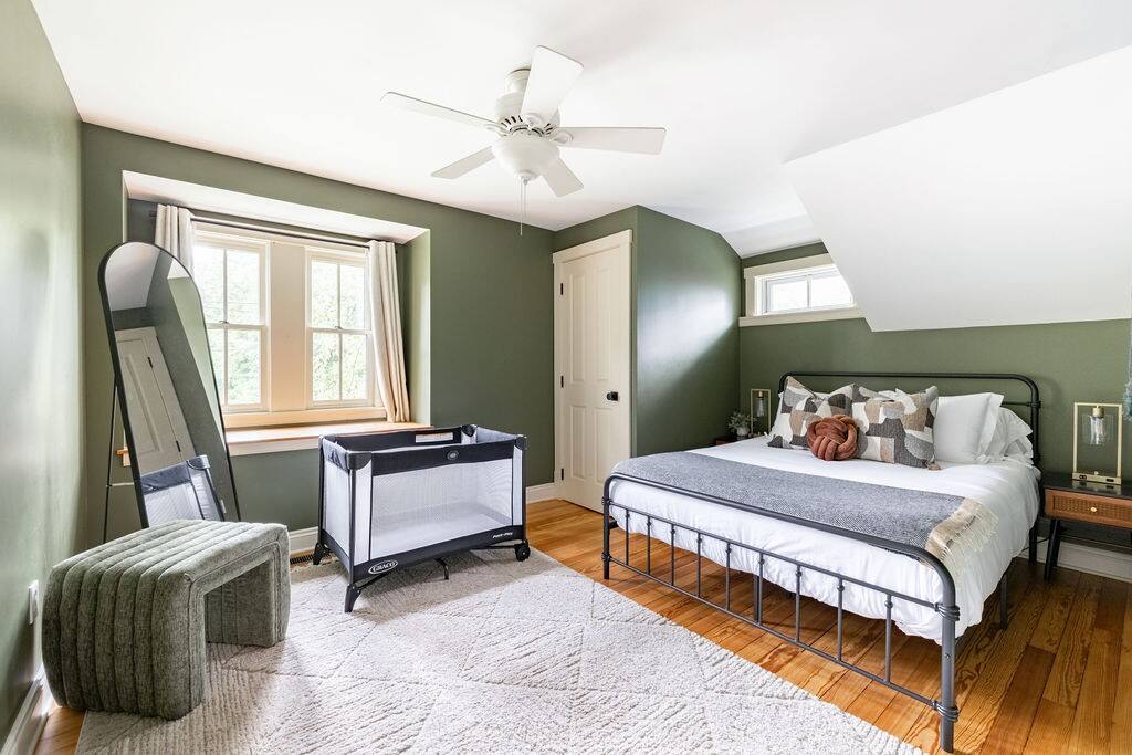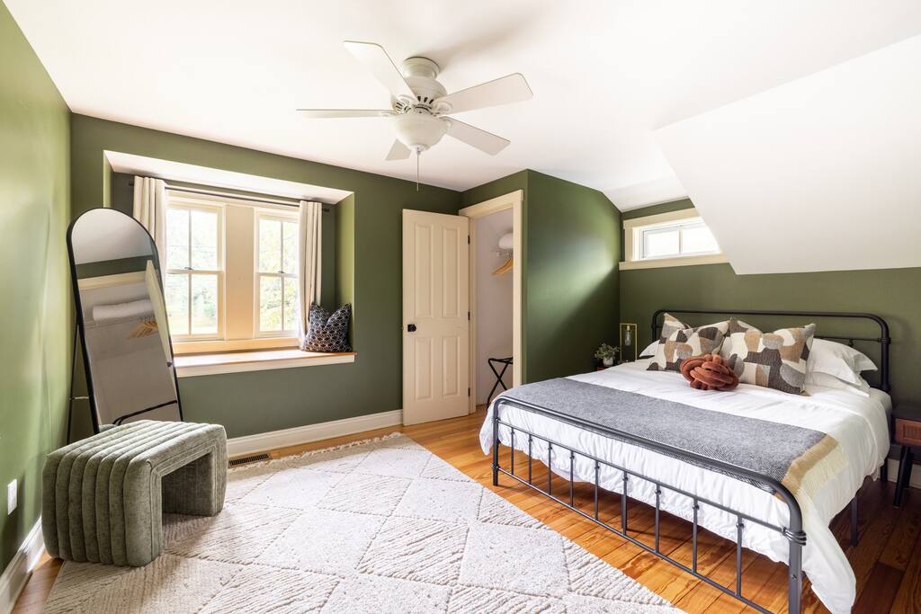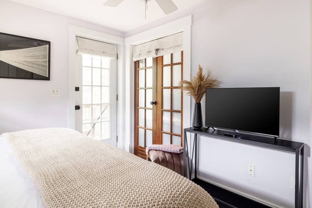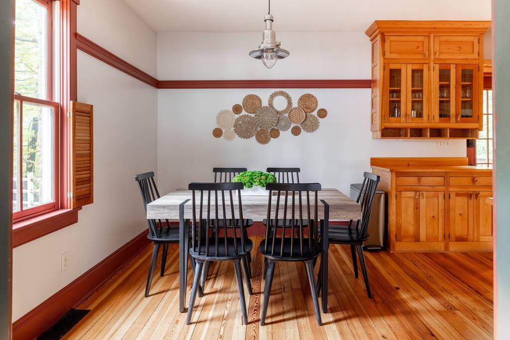 Enjoy the balance of nature and convenience in our home that will comfortably accommodate up to 6 guests. With serene wooded views from the hot tub and an on-property trail that leads to a waterfall view, our home is perfect for nature lovers or those looking for a relaxing escape. This home features three cozy bedrooms and one and a half bathrooms. The primary bedroom is complete with a plush king-size bed and a private balcony for morning coffee while the other two bedrooms are furnished with queen-sized beds. All bedrooms have blackout blinds, extra pillows and blankets, Roku TVs, and USB ports for your device charging. The fully stocked kitchen, including spices and cooking oil, is perfect for making home-cooked meals while the dining room has ample space to fit everyone. You’ll love lounging in the aesthetically designed living room playing games or watching Roku TV with your group. Finally, the three seasons room offers a beautiful spot for morning yoga, enjoying a nature view, or curling up with a book. Step outside and discover your private oasis. The hot tub and fire pit, overlooking a wooded area, set the scene for cozy evenings under the stars with six adirondack chairs. Roast marshmallows, share stories, and create lasting memories with loved ones. The outdoor gas grill is perfect for barbecue nights, and the spacious front yard provides ample room for yard games and outdoor activities. Please note that this is a historic home and there are some slanted ceilings on the second floor. It’s also located on a main road through the village. Short Term Rental Operator License: 2026-06