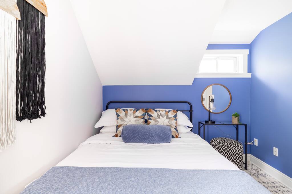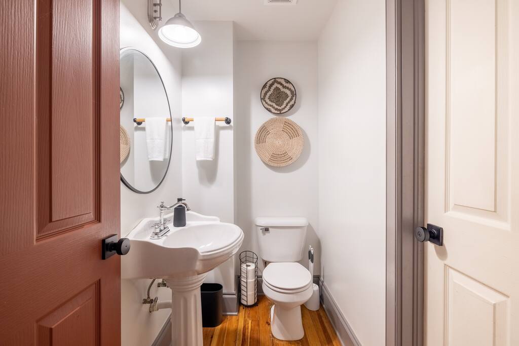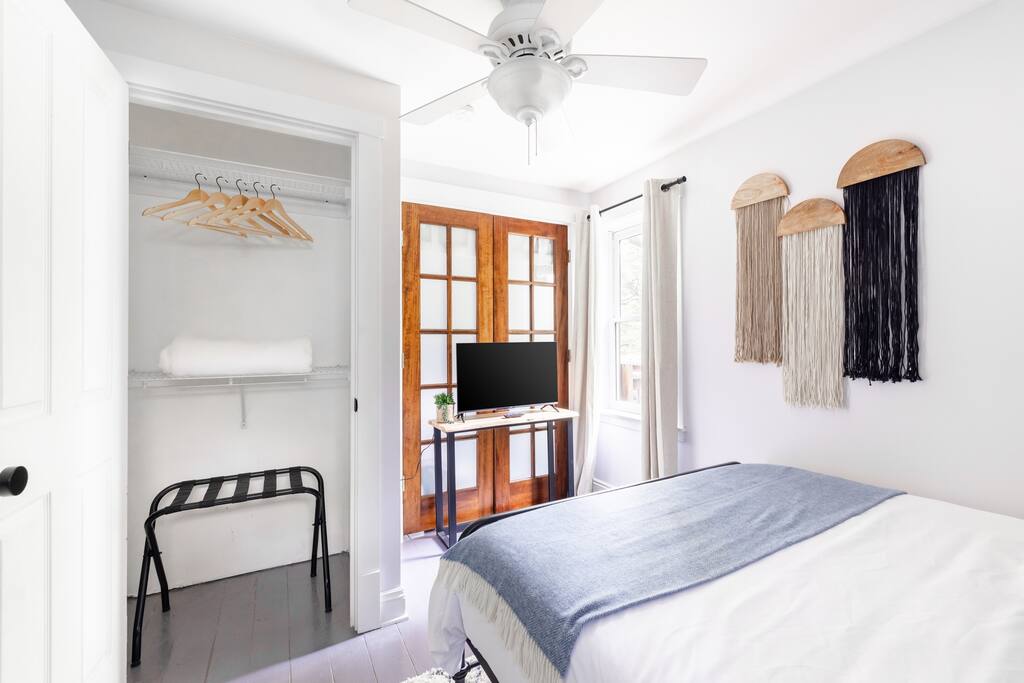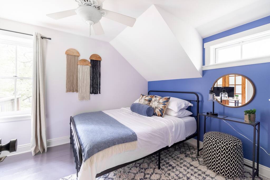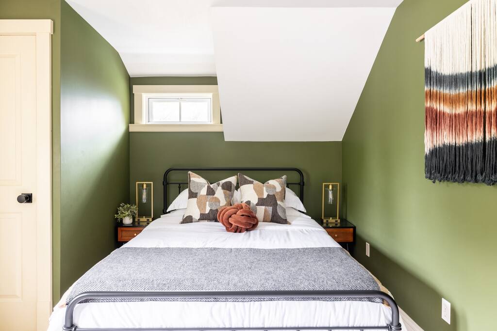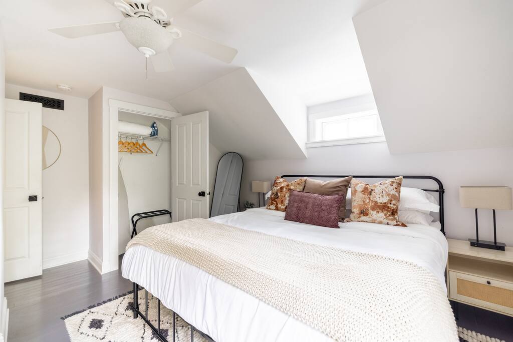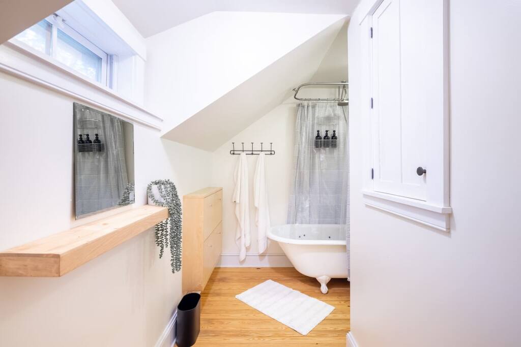 Enjoy the balance of nature and convenience in our home that will comfortably accommodate up to 6 guests. With serene wooded views from the hot tub and an on-property trail that leads to a waterfall view, our home is perfect for nature lovers or those looking for a relaxing escape. This home features three cozy bedrooms and one and a half bathrooms. The primary bedroom is complete with a plush king-size bed and a private balcony for morning coffee while the other two bedrooms are furnished with queen-sized beds. All bedrooms have blackout blinds, extra pillows and blankets, Roku TVs, and USB ports for your device charging. The fully stocked kitchen, including spices and cooking oil, is perfect for making home-cooked meals while the dining room has ample space to fit everyone. You’ll love lounging in the aesthetically designed living room playing games or watching Roku TV with your group. Finally, the three seasons room offers a beautiful spot for morning yoga, enjoying a nature view, or curling up with a book. Step outside and discover your private oasis. The hot tub and fire pit, overlooking a wooded area, set the scene for cozy evenings under the stars with six adirondack chairs. Roast marshmallows, share stories, and create lasting memories with loved ones. The outdoor gas grill is perfect for barbecue nights, and the spacious front yard provides ample room for yard games and outdoor activities. Please note that this is a historic home and there are some slanted ceilings on the second floor. It’s also located on a main road through the village. Short Term Rental Operator License: 2026-06