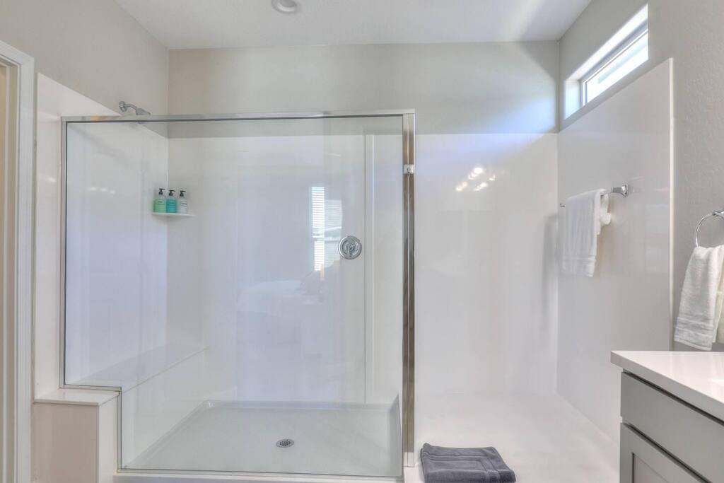 There are four great bedrooms each with a queen bed and side tables. Two of the four rooms have walk-in closets and one includes a television with Roku and two full bathrooms are shared amongst these four rooms. The primary suite with en-suite bathroom has a king-sized bed with a sitting area, a Roku TV, and plenty of space. The luxurious en-suite bathroom has a walk-in closet and walk-in shower. The kitchen is open to the dining and living space and provides easy access to the covered back patio through full glass doors. There is a large laundry room off the two car garage and the yard is fully fenced.