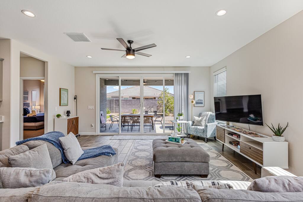 Enjoy the warmth of this new construction, single level home with 5 spacious bedrooms, 3 bathrooms, and outdoor dining. Located in the coveted Rancho Mirage community, this new home boasts an ideal floor plan with a two car garage, gourmet kitchen, & fully-fenced yard. You'll love the open kitchen, dining, & living space with ceramic tile floors that seamlessly transitions to the covered patio through full glass doors. 4 queen beds and 1 king bed and 3 full bathrooms, and 3 Smart Roku TVs!