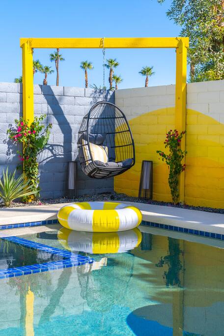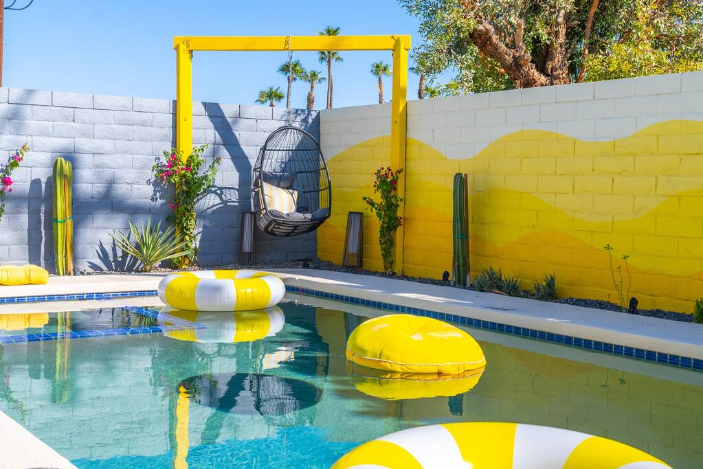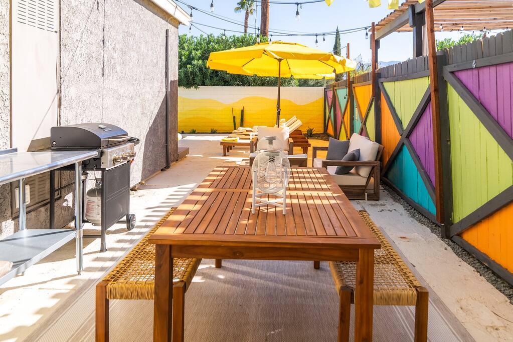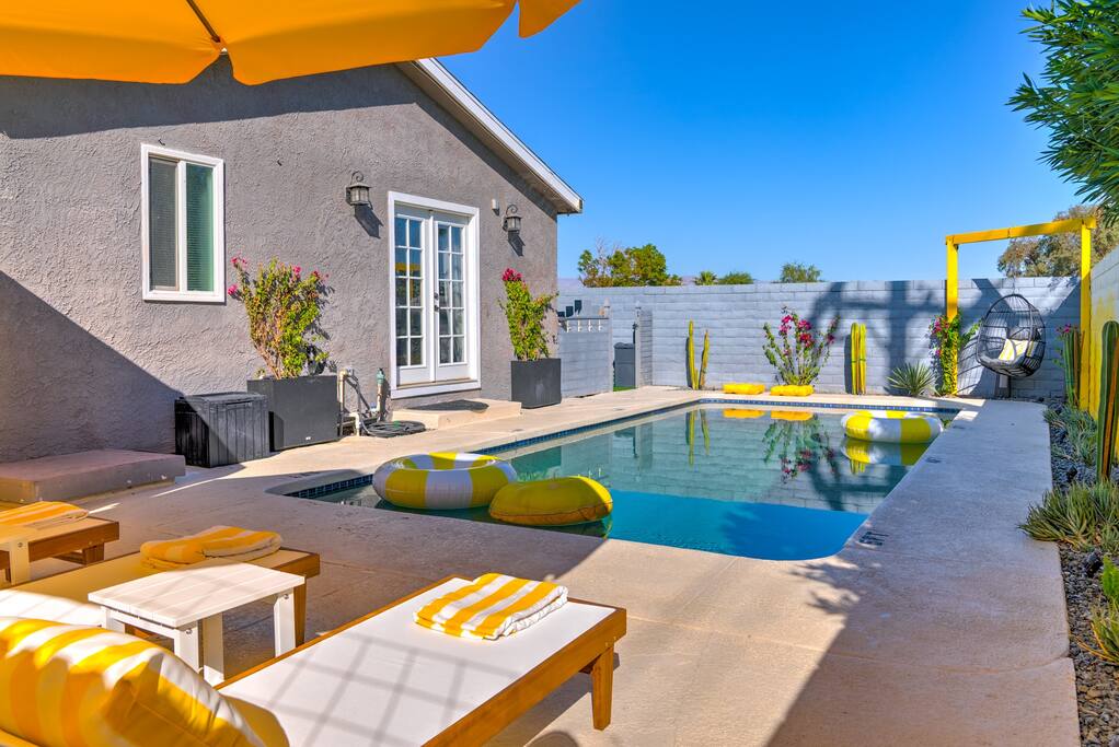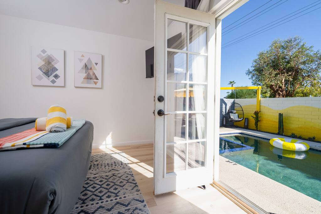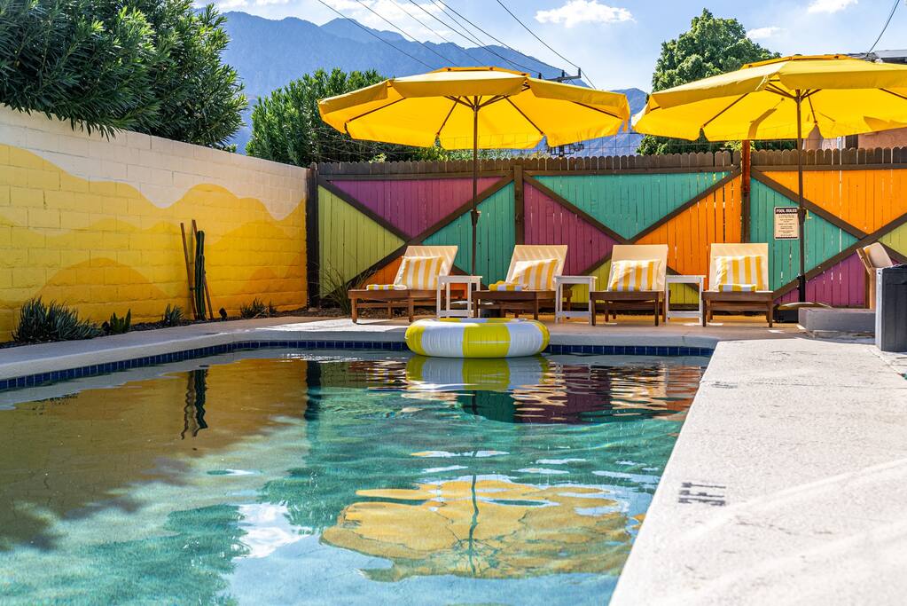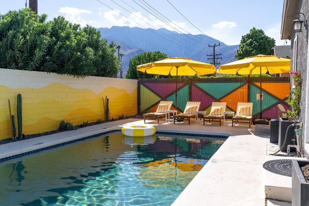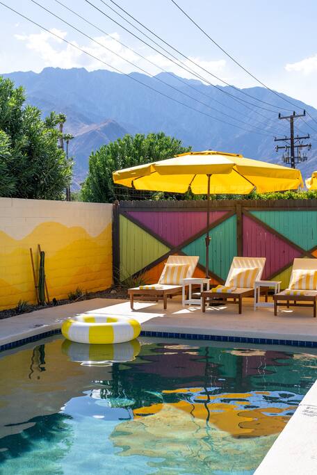 Limoncello is bold & colorful, perfect for Palm Springs! Enjoy a full living room with games and a TV with Roku built-in. Dine comfortably with up to six people in the full dining room off of the stocked kitchen complete with appliances and a coffee machine + coffee bar. Two bedrooms off the main hallway have queen beds and closets with hangers and share a full bathroom in the hallway. The primary bedroom, which opens onto the pool through French doors, has a seating area and a full bathroom with double vanity and laundry. In the back, your pool and spa look up to the mountains and wrap around to connect with your outdoor dining and living spaces. Off the pool, you'll find a side yard with pet relief area. The Primary Bedroom: Relax in the king-sized bed with a view of the pool. A Roku TV is provided in the room, along with accessible outlets for phone charging on both sides of the bed and blackout curtains. The double vanity in the bathroom and walk-in shower provide comfort. The washer & dryer are located next to the bathroom, along with a separate closet for hanging your clothes. The bedrooms: Each bedroom is equipped with a queen-sized bed, blackout curtains, and a Roku TV in each room. Easily accessible outlets for phone charging are available in both bedrooms, along with closets with hangers and luggage stands. Kitchen: The kitchen is fully stocked with baking sheets, ample pots and pans, cutting boards, blender, toaster, and wine & pool glasses for every person in your party. You'll also have a cocktail shaker, shot glasses, and tumblers for the pool. There’s a coffee maker, filters, coffee syrups and coffee grounds that our guests are welcome to use. The refrigerator & freezer have plenty of space and a popcorn bar with fun flavored toppings.