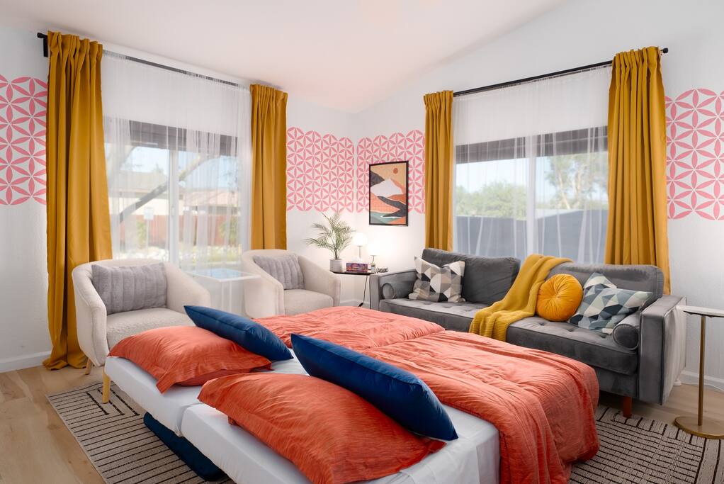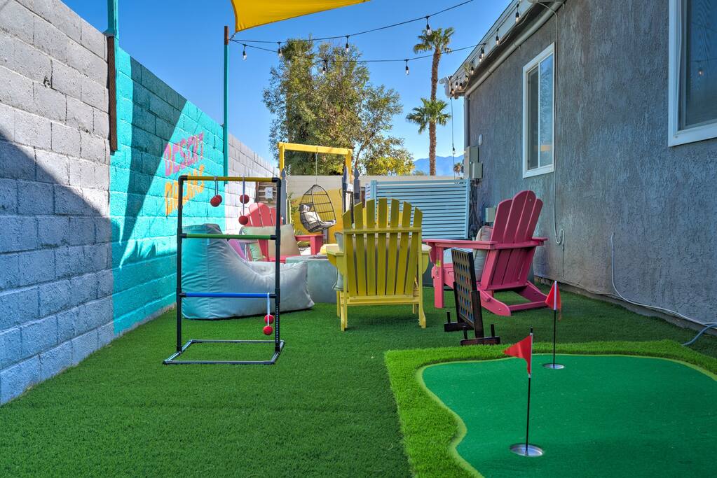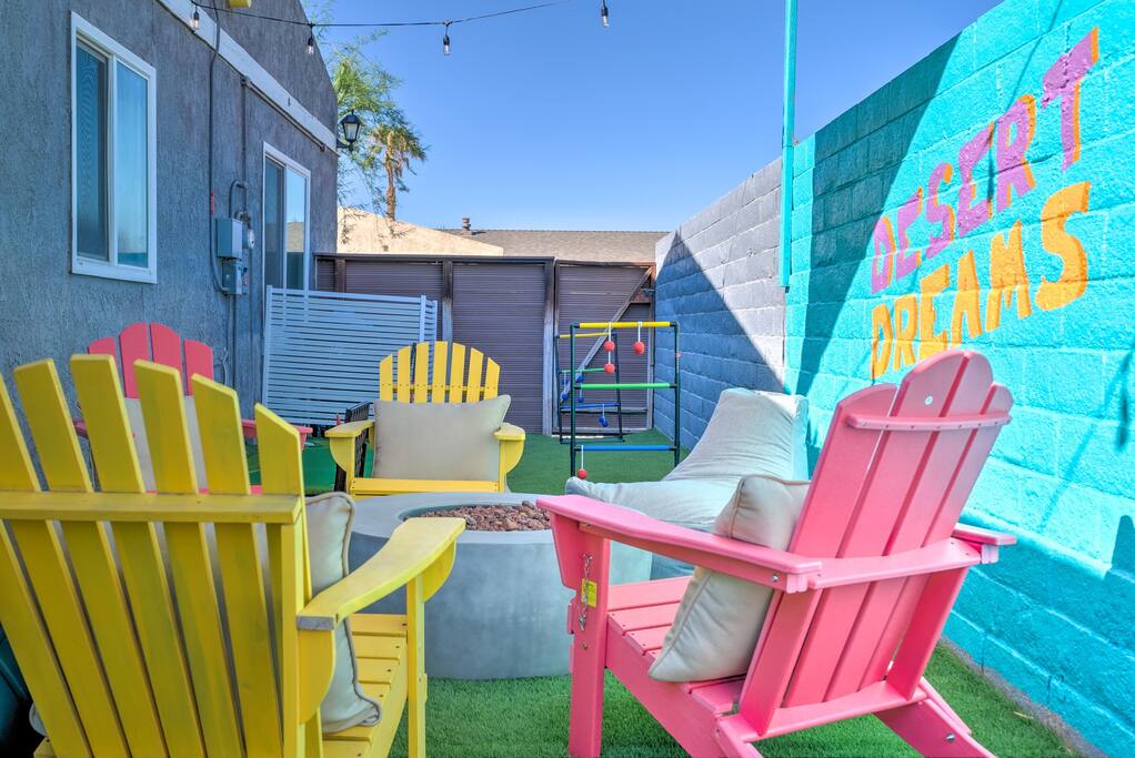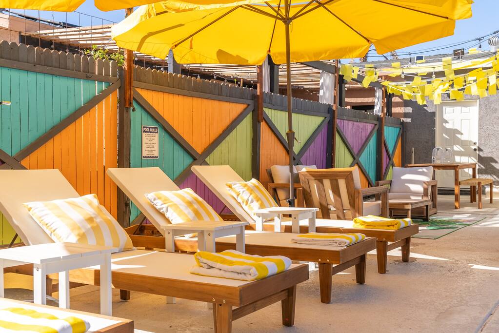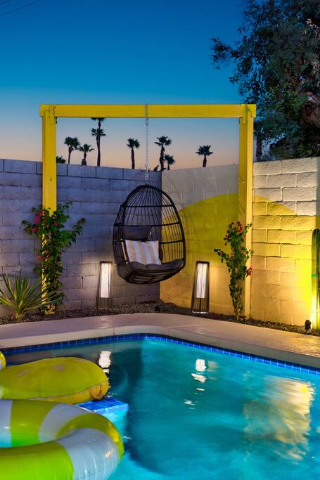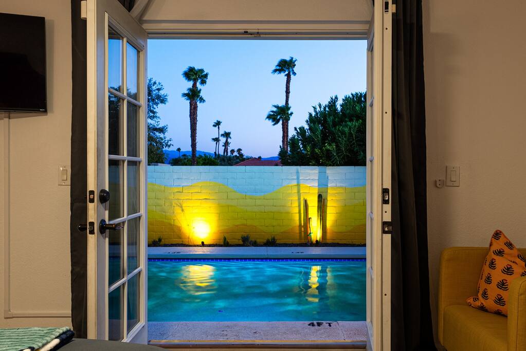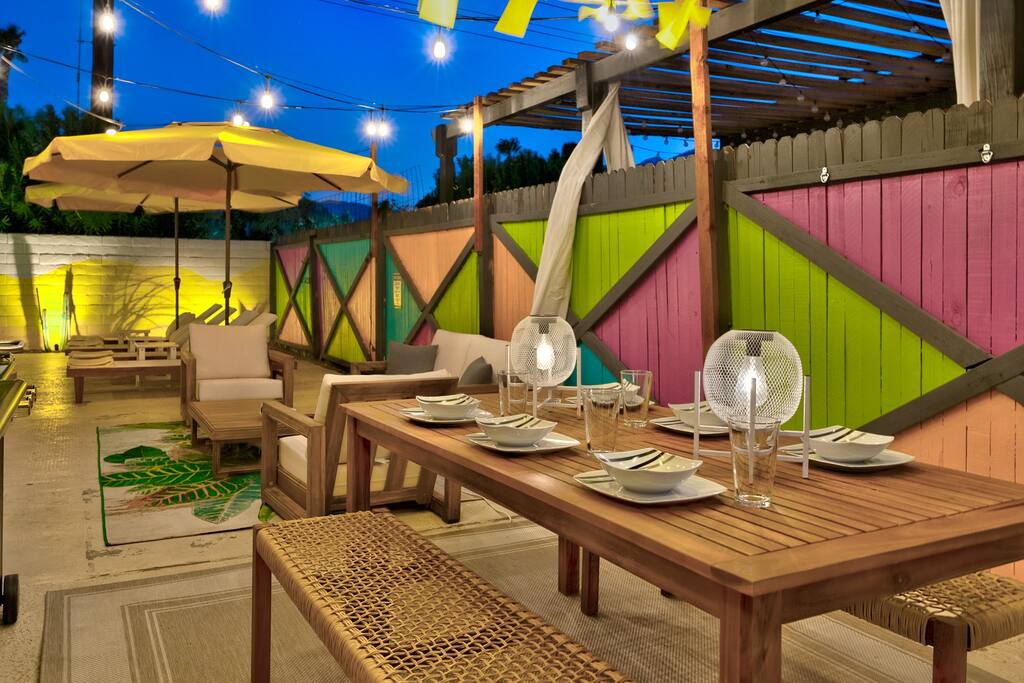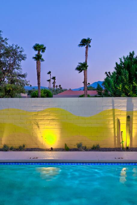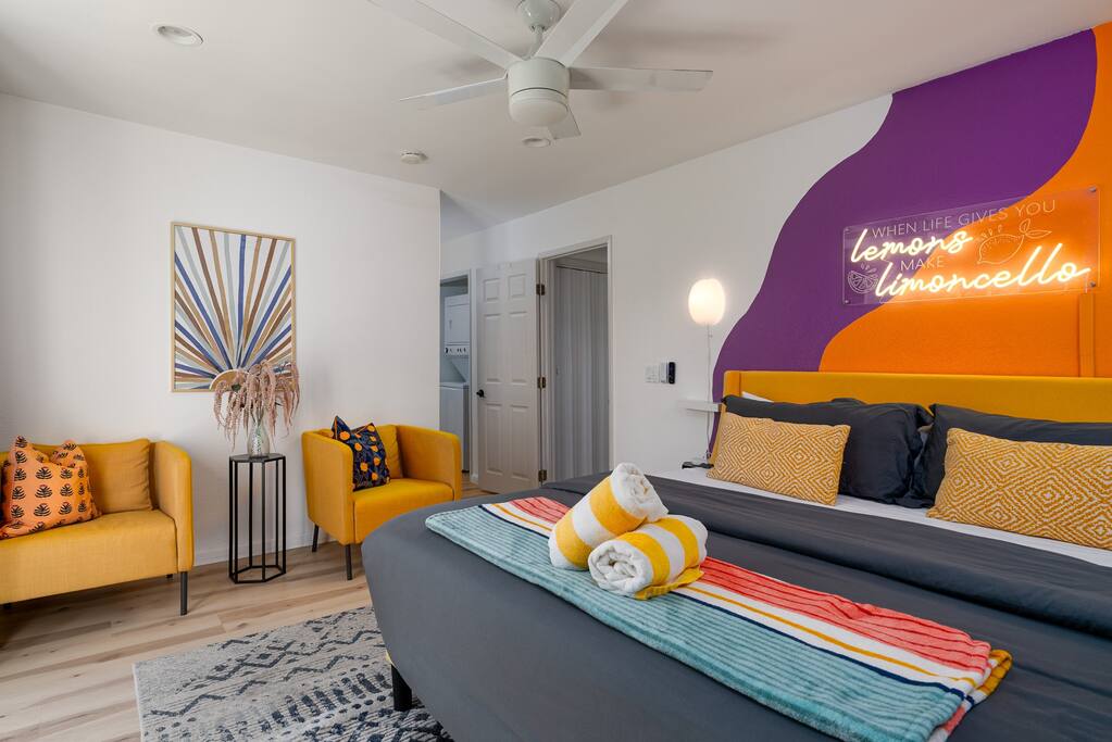 Limoncello is bold & colorful, perfect for Palm Springs! Enjoy a full living room with games and a TV with Roku built-in. Dine comfortably with up to six people in the full dining room off of the stocked kitchen complete with appliances and a coffee machine + coffee bar. Two bedrooms off the main hallway have queen beds and closets with hangers and share a full bathroom in the hallway. The primary bedroom, which opens onto the pool through French doors, has a seating area and a full bathroom with double vanity and laundry. In the back, your pool and spa look up to the mountains and wrap around to connect with your outdoor dining and living spaces. Off the pool, you'll find a side yard with pet relief area. The Primary Bedroom: Relax in the king-sized bed with a view of the pool. A Roku TV is provided in the room, along with accessible outlets for phone charging on both sides of the bed and blackout curtains. The double vanity in the bathroom and walk-in shower provide comfort. The washer & dryer are located next to the bathroom, along with a separate closet for hanging your clothes. The bedrooms: Each bedroom is equipped with a queen-sized bed, blackout curtains, and a Roku TV in each room. Easily accessible outlets for phone charging are available in both bedrooms, along with closets with hangers and luggage stands. Kitchen: The kitchen is fully stocked with baking sheets, ample pots and pans, cutting boards, blender, toaster, and wine & pool glasses for every person in your party. You'll also have a cocktail shaker, shot glasses, and tumblers for the pool. There’s a coffee maker, filters, coffee syrups and coffee grounds that our guests are welcome to use. The refrigerator & freezer have plenty of space and a popcorn bar with fun flavored toppings.