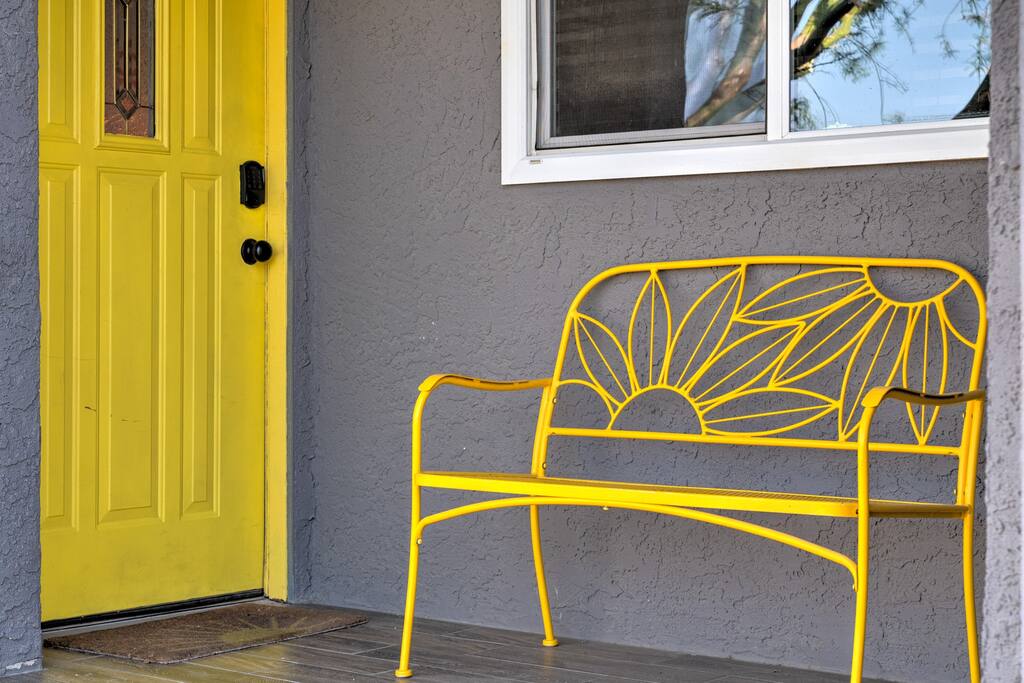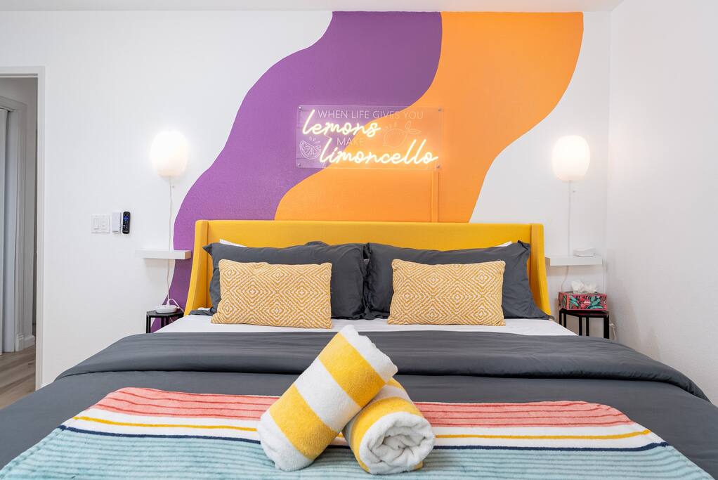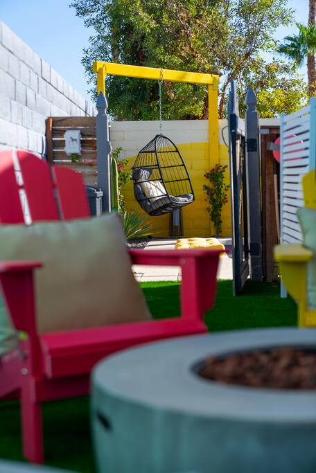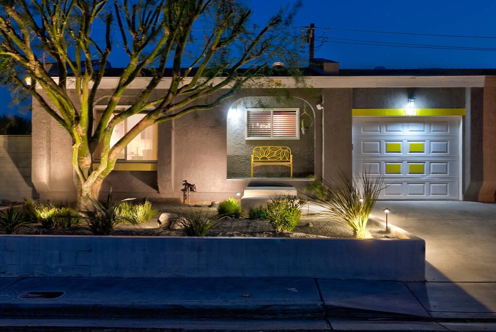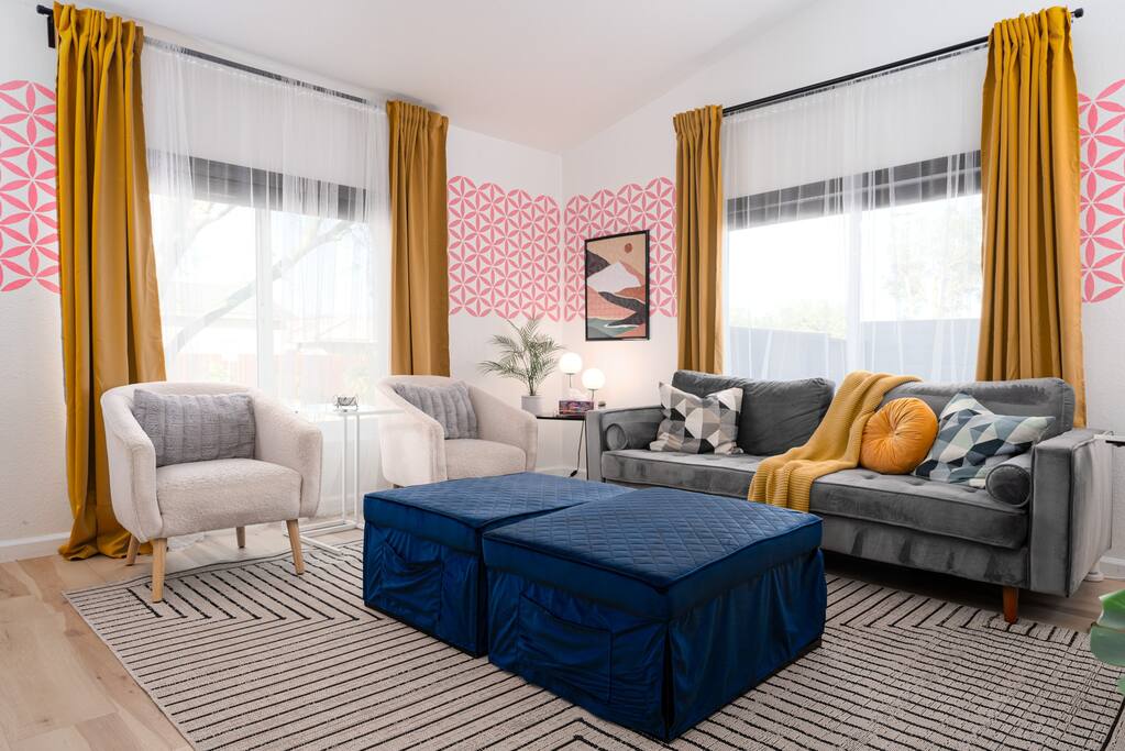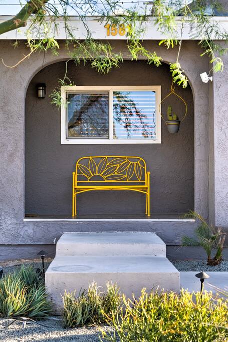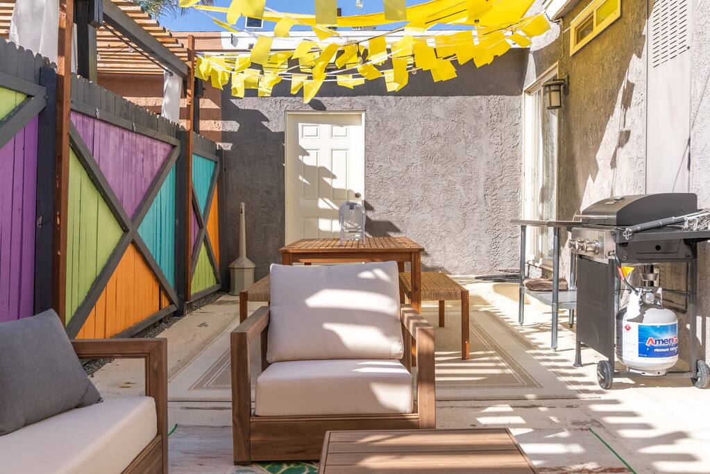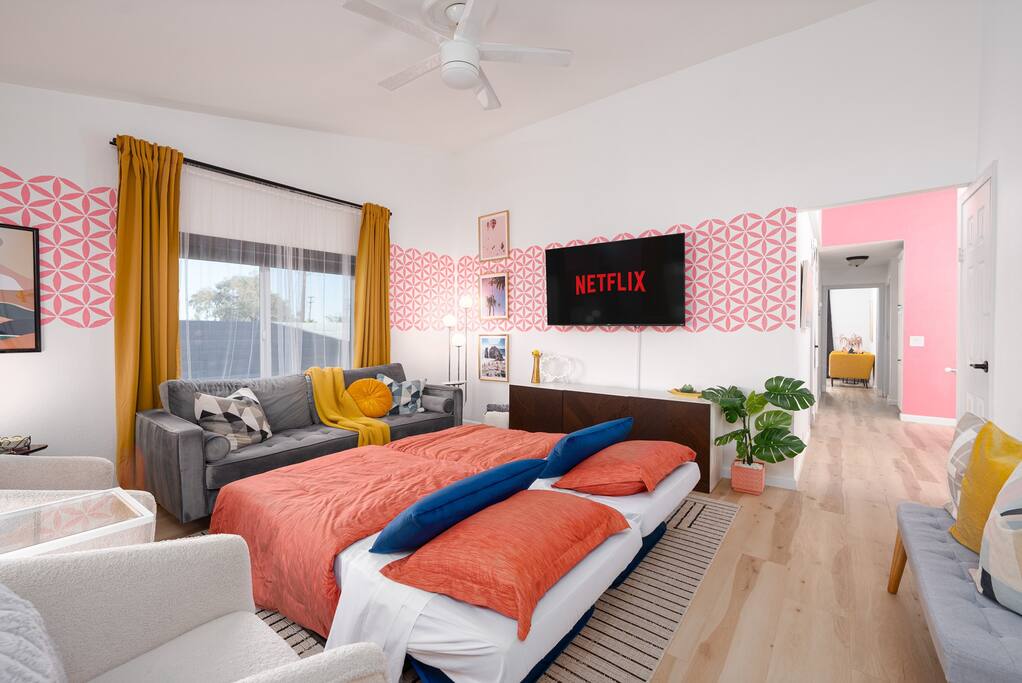 Limoncello is bold & colorful, perfect for Palm Springs! Enjoy a full living room with games and a TV with Roku built-in. Dine comfortably with up to six people in the full dining room off of the stocked kitchen complete with appliances and a coffee machine + coffee bar. Two bedrooms off the main hallway have queen beds and closets with hangers and share a full bathroom in the hallway. The primary bedroom, which opens onto the pool through French doors, has a seating area and a full bathroom with double vanity and laundry. In the back, your pool and spa look up to the mountains and wrap around to connect with your outdoor dining and living spaces. Off the pool, you'll find a side yard with pet relief area. The Primary Bedroom: Relax in the king-sized bed with a view of the pool. A Roku TV is provided in the room, along with accessible outlets for phone charging on both sides of the bed and blackout curtains. The double vanity in the bathroom and walk-in shower provide comfort. The washer & dryer are located next to the bathroom, along with a separate closet for hanging your clothes. The bedrooms: Each bedroom is equipped with a queen-sized bed, blackout curtains, and a Roku TV in each room. Easily accessible outlets for phone charging are available in both bedrooms, along with closets with hangers and luggage stands. Kitchen: The kitchen is fully stocked with baking sheets, ample pots and pans, cutting boards, blender, toaster, and wine & pool glasses for every person in your party. You'll also have a cocktail shaker, shot glasses, and tumblers for the pool. There’s a coffee maker, filters, coffee syrups and coffee grounds that our guests are welcome to use. The refrigerator & freezer have plenty of space and a popcorn bar with fun flavored toppings.