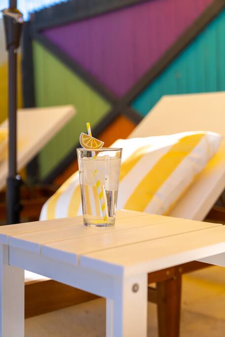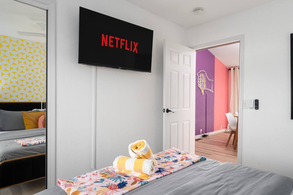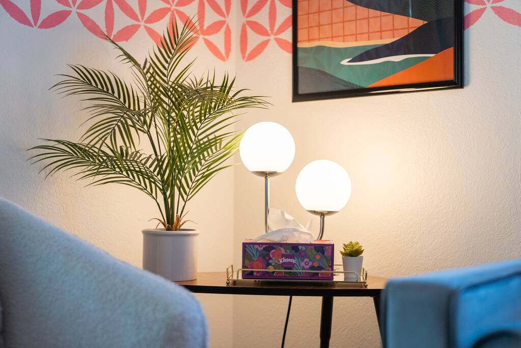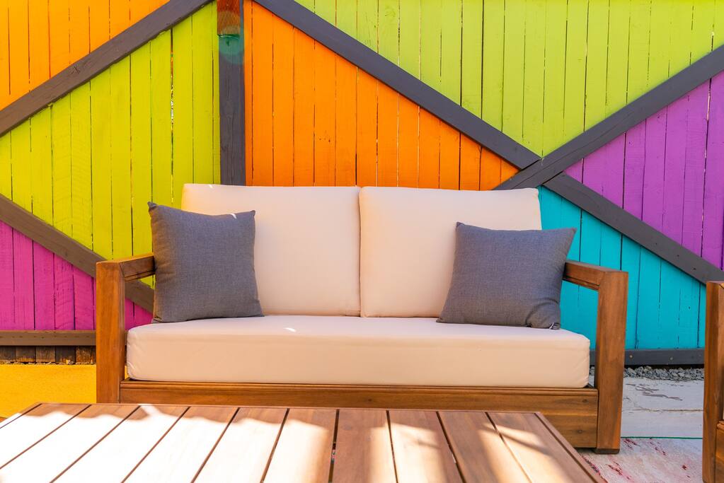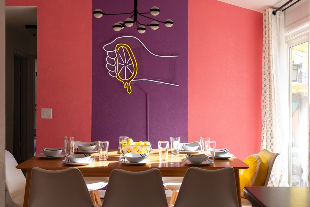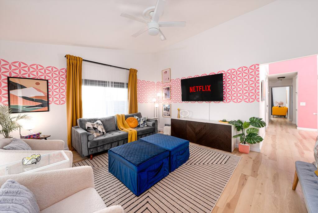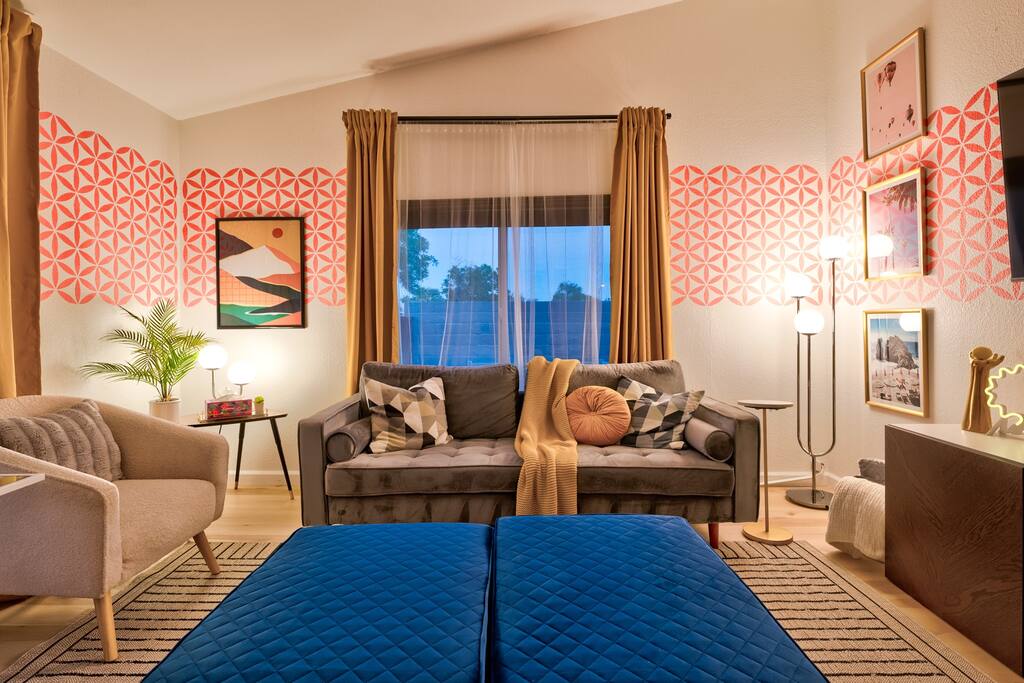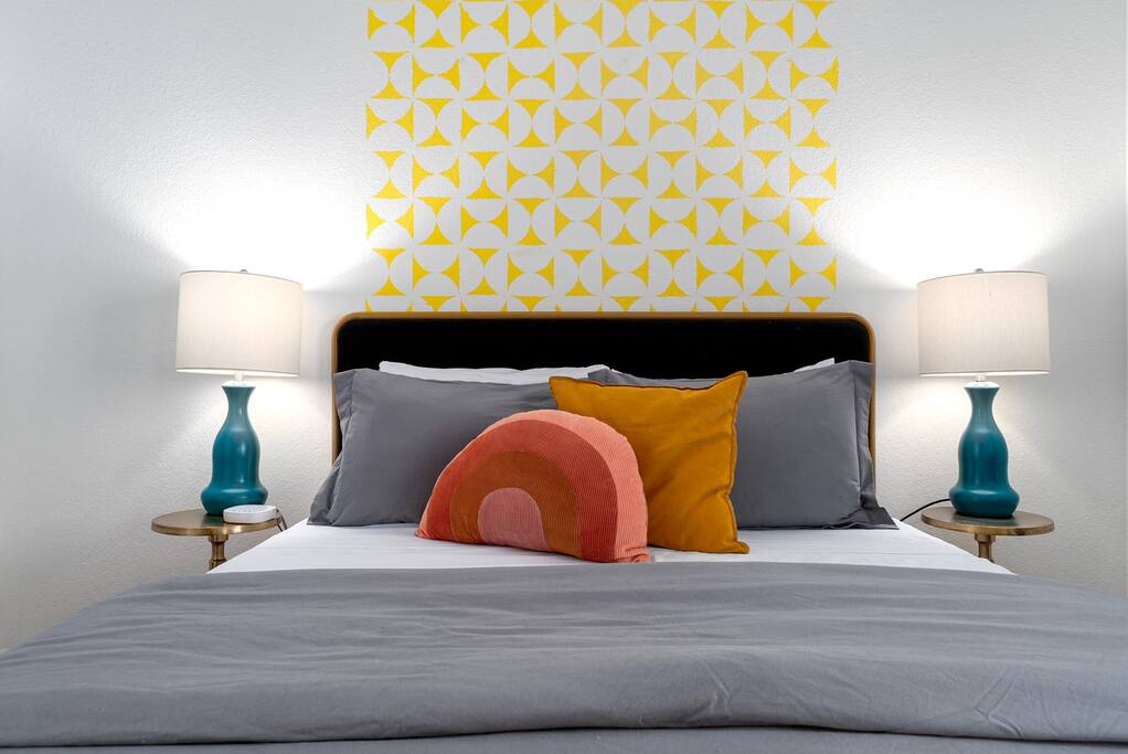 Limoncello is bold & colorful, perfect for Palm Springs! Enjoy a full living room with games and a TV with Roku built-in. Dine comfortably with up to six people in the full dining room off of the stocked kitchen complete with appliances and a coffee machine + coffee bar. Two bedrooms off the main hallway have queen beds and closets with hangers and share a full bathroom in the hallway. The primary bedroom, which opens onto the pool through French doors, has a seating area and a full bathroom with double vanity and laundry. In the back, your pool and spa look up to the mountains and wrap around to connect with your outdoor dining and living spaces. Off the pool, you'll find a side yard with pet relief area. The Primary Bedroom: Relax in the king-sized bed with a view of the pool. A Roku TV is provided in the room, along with accessible outlets for phone charging on both sides of the bed and blackout curtains. The double vanity in the bathroom and walk-in shower provide comfort. The washer & dryer are located next to the bathroom, along with a separate closet for hanging your clothes. The bedrooms: Each bedroom is equipped with a queen-sized bed, blackout curtains, and a Roku TV in each room. Easily accessible outlets for phone charging are available in both bedrooms, along with closets with hangers and luggage stands. Kitchen: The kitchen is fully stocked with baking sheets, ample pots and pans, cutting boards, blender, toaster, and wine & pool glasses for every person in your party. You'll also have a cocktail shaker, shot glasses, and tumblers for the pool. There’s a coffee maker, filters, coffee syrups and coffee grounds that our guests are welcome to use. The refrigerator & freezer have plenty of space and a popcorn bar with fun flavored toppings.