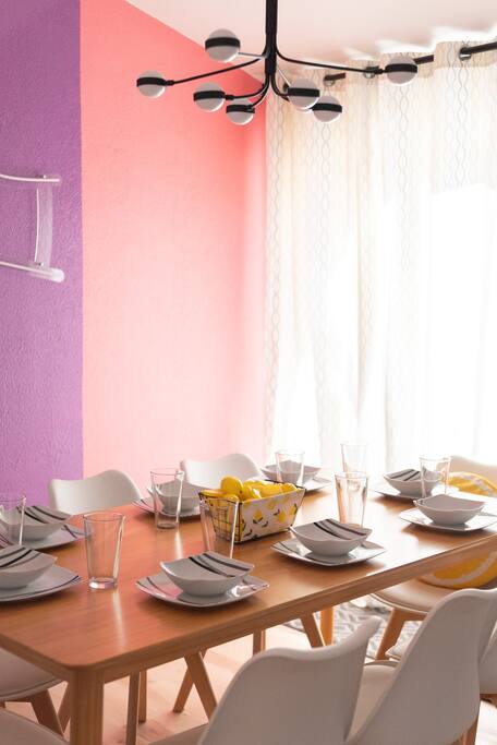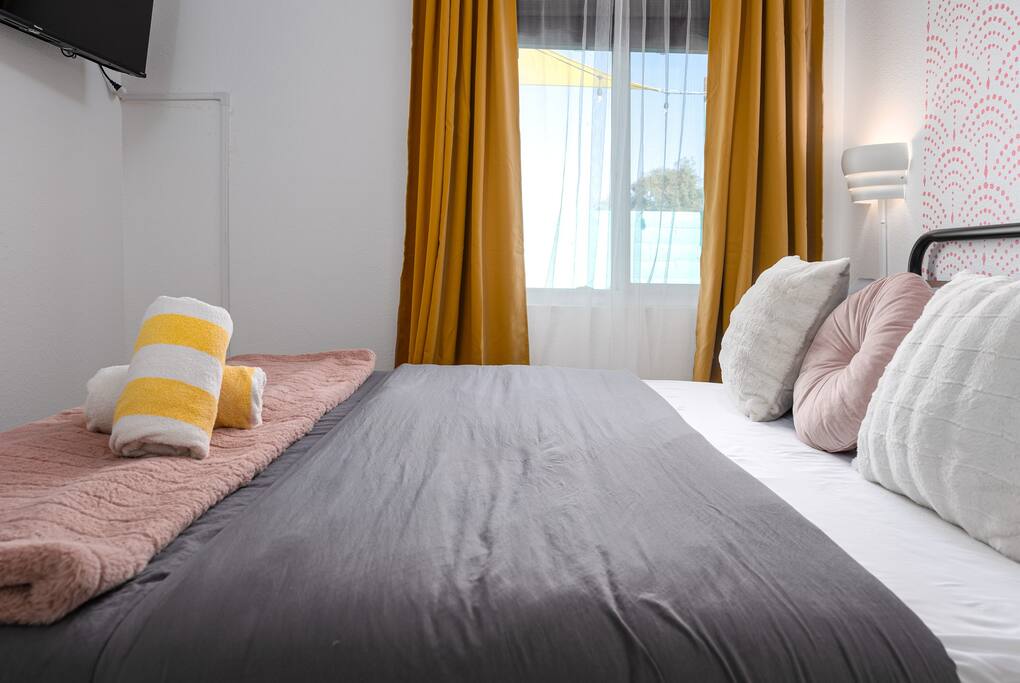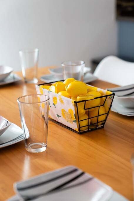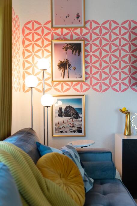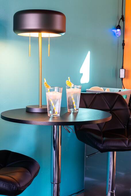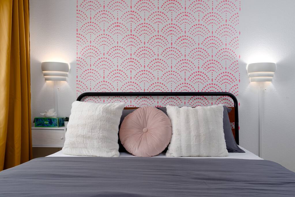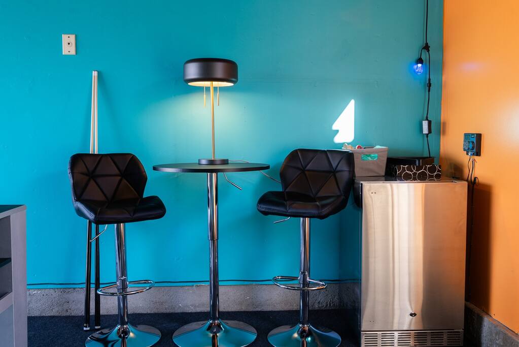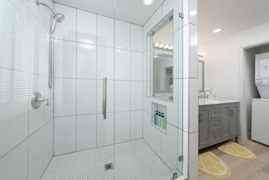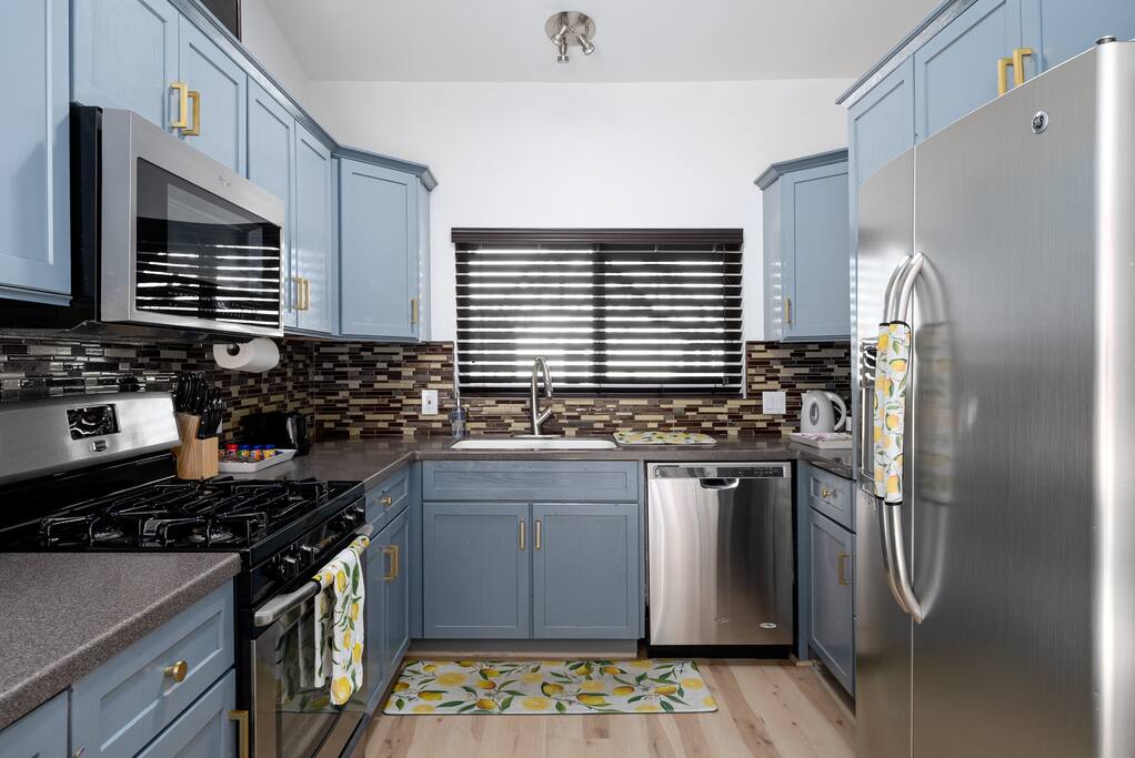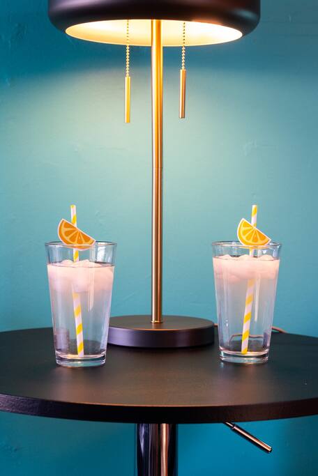 Limoncello is bold & colorful, perfect for Palm Springs! Enjoy a full living room with games and a TV with Roku built-in. Dine comfortably with up to six people in the full dining room off of the stocked kitchen complete with appliances and a coffee machine + coffee bar. Two bedrooms off the main hallway have queen beds and closets with hangers and share a full bathroom in the hallway. The primary bedroom, which opens onto the pool through French doors, has a seating area and a full bathroom with double vanity and laundry. In the back, your pool and spa look up to the mountains and wrap around to connect with your outdoor dining and living spaces. Off the pool, you'll find a side yard with pet relief area. The Primary Bedroom: Relax in the king-sized bed with a view of the pool. A Roku TV is provided in the room, along with accessible outlets for phone charging on both sides of the bed and blackout curtains. The double vanity in the bathroom and walk-in shower provide comfort. The washer & dryer are located next to the bathroom, along with a separate closet for hanging your clothes. The bedrooms: Each bedroom is equipped with a queen-sized bed, blackout curtains, and a Roku TV in each room. Easily accessible outlets for phone charging are available in both bedrooms, along with closets with hangers and luggage stands. Kitchen: The kitchen is fully stocked with baking sheets, ample pots and pans, cutting boards, blender, toaster, and wine & pool glasses for every person in your party. You'll also have a cocktail shaker, shot glasses, and tumblers for the pool. There’s a coffee maker, filters, coffee syrups and coffee grounds that our guests are welcome to use. The refrigerator & freezer have plenty of space and a popcorn bar with fun flavored toppings.