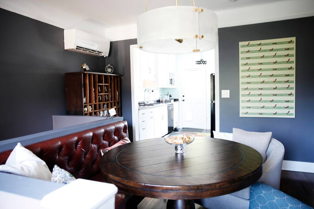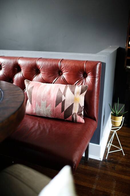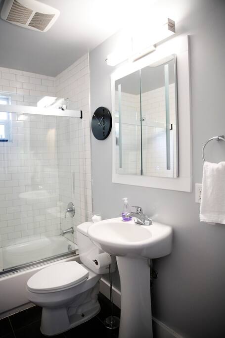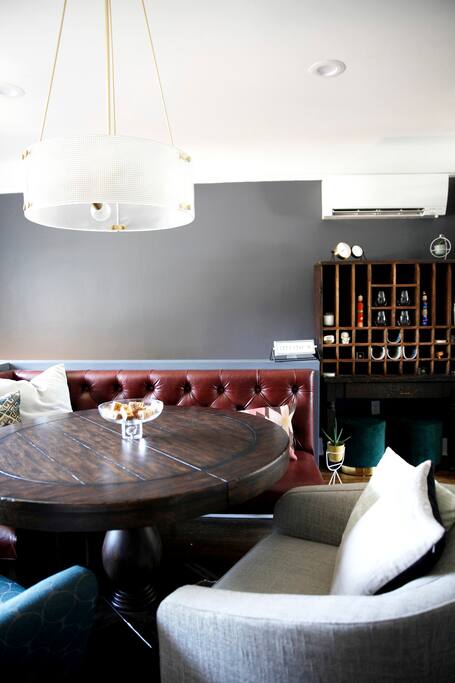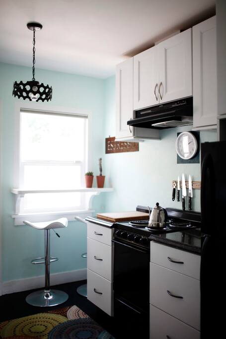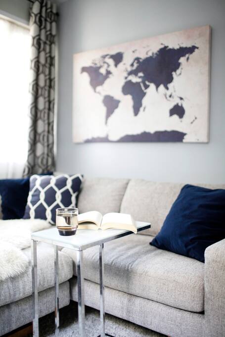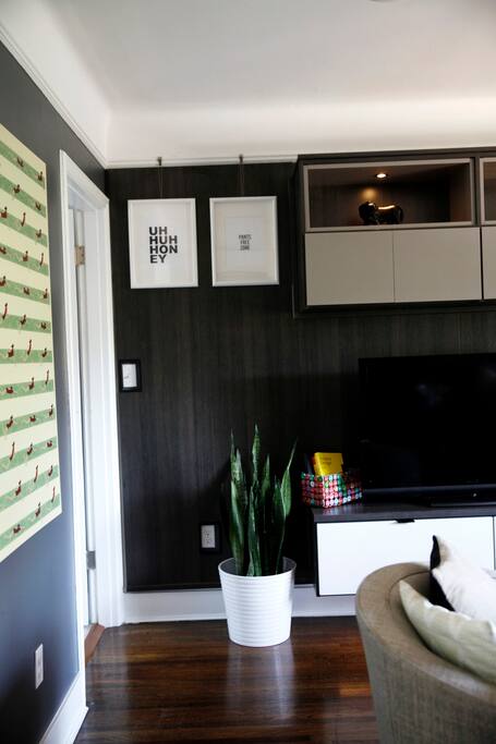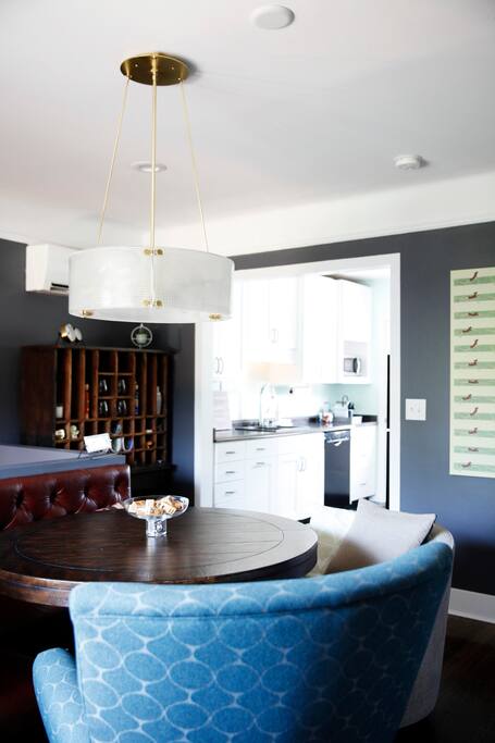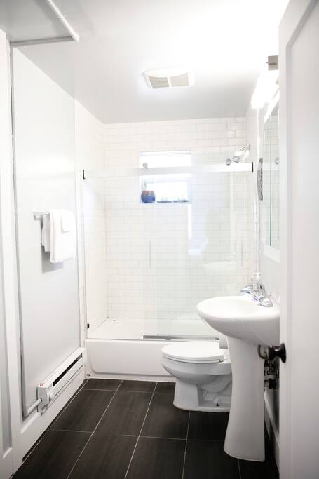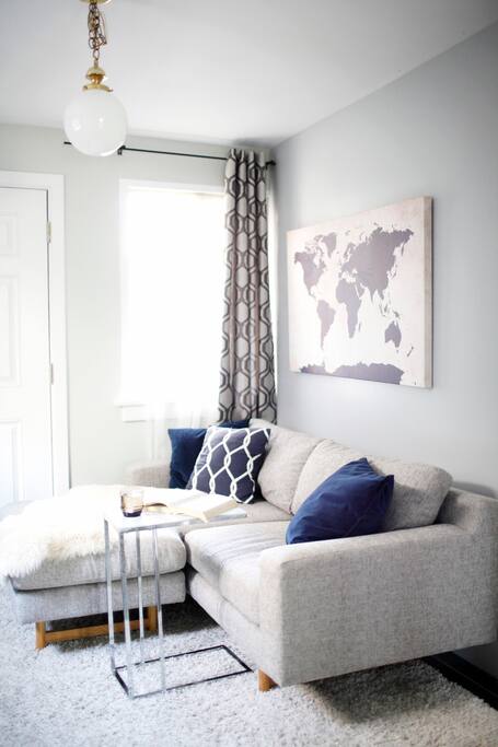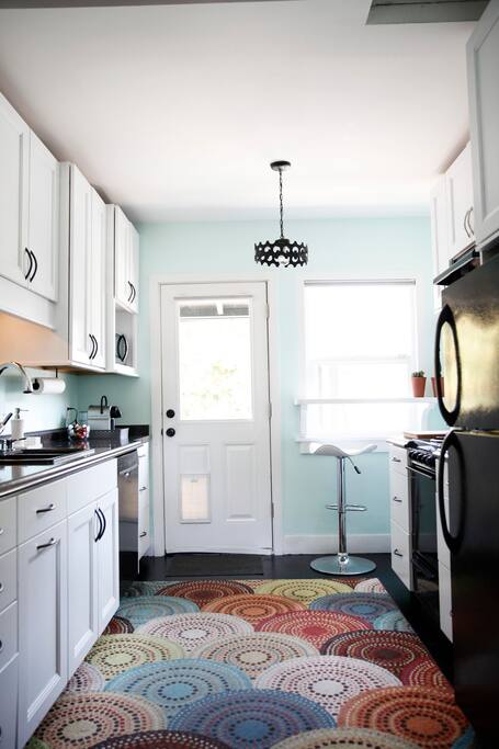 On the first level of the townhome, there is an efficient living space with a classic large roundtable perfect to gather around for a meal, watch a program on the TV, or get some work done on your laptop. The kitchen is fully equipped for you to stay home and cook a meal in. In the first floor bathroom you can also take advantage of laundry facilities - we provide detergent. Just down the stairs from the living area, you can enjoy a cozy TV den with a comfortable sectional couch, perfect for an afternoon nap. The downstairs bedroom includes a queen bed and an en suite bathroom, with towels and basic amenities provided. There's also a beautiful private and secluded raised patio for you to relax in the sun when you're not enjoying the sites of the city. We love grilling in the summer and enjoying this sun-splashed space, relaxing with a glass of wine in hand :)